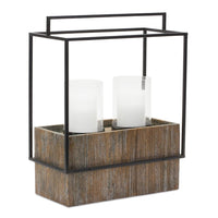 Delight your guests with this beautiful Framed Candle Holder. Measuring 18' tall, this piece is a great fit for your modern or contemporary style of d?cor. The distressed natural wooden finish paired with the modern metal frame and delicate glass hurricane insert is the perfect combination to create a stunning display. The quality iron metal and solid fir wood composition is sure to endure for seasons to come. Illuminate the piece with a real wax or LED candle. Candle sold separately, this piece best fits a 3' pillar candle.
