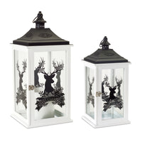 Merry Christmas Lantern (Set of 2) 17.5''H, 22.75''H Wood Get ready for the holiday season with this set of Christmas lanterns. The traditional black and white finish paired with the printed glass accent is the perfect combination to make a joyous piece. The deer outline with the phrase ''Merry Christmas'' is printed on each window pane. The sturdy wooden and metal composition is sure to last for seasons to come. Just add a real wax or LED candle to complete the look. Measures 10.25 x 10.25 x 22.75 Primary Materials: Wood Reccommended for indoor and outdoor covered use only Candles sold separately