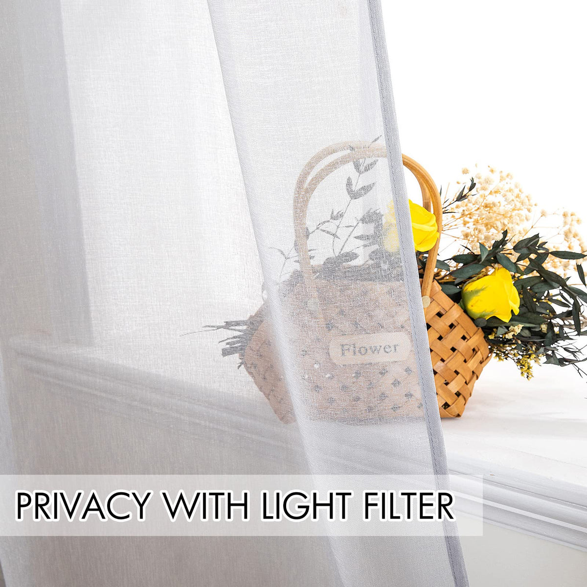 PACKAGE - Sold as 2 solid sheer curtain panels. Each panel measures 54 inch wide x 96 inch length. Total width is 108 inch width. The Inner diameter of grommet is 1.6 inches (4cm). 8 silver metal rings on top to suit with standard or decorative curtain rod. LINEN LOOK MATERIAL - These sheer curtains adopt high-quality faux linen textured fabric, which is soft, lightweight and durable. It looks more special and elegant in an aesthetic feeling, perfect for modern and casual style. SEMI-TRANSPARENT - With using the linen textured material, sheer drapes help to enhance privacy while still letting sunlight coming through. Do stop the light glare and give you light & airy feel. GOOD DECORATION - Curtains suitable for most of windows and shutters, it also can be hung separately or paired with other curtains. Ready made to match your blackout curtains, velvet curtains, curtain valances, blinds or any window treatments. Also can be used a divider between our bedroom and sitting room. EASY CARE - Machine washable in cold water, gentle cycle, tumble dry. Cool iron if needed.The wrinkles will press out easy with a light setting iron if needed. Do Not Bleach.