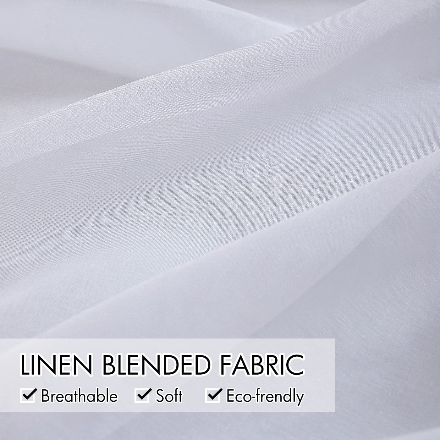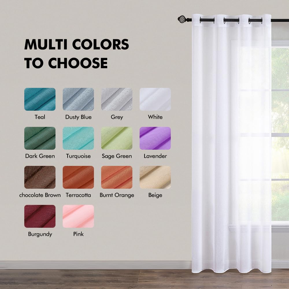 PACKAGE - Sold as 2 solid sheer curtain panels. Each panel measures 54 inch wide x 84 inch length. Total width is 108 inch width. The Inner diameter of grommet is 1.6 inches (4cm). 8 silver metal rings on top to suit with standard or decorative curtain rod. LINEN LOOK MATERIAL - These sheer curtains adopt high-quality faux linen textured fabric, which is soft, lightweight and durable. It looks more special and elegant in an aesthetic feeling, perfect for modern and casual style. SEMI-TRANSPARENT - With using the linen textured material, sheer drapes help to enhance privacy while still letting sunlight coming through. Do stop the light glare and give you light & airy feel. GOOD DECORATION - Curtains suitable for most of windows and shutters, it also can be hung separately or paired with other curtains. Ready made to match your blackout curtains, velvet curtains, curtain valances, blinds or any window treatments. Also can be used a divider between our bedroom and sitting room. EASY CARE - Machine washable in cold water, gentle cycle, tumble dry. Cool iron if needed.The wrinkles will press out easy with a light setting iron if needed. Do Not Bleach.