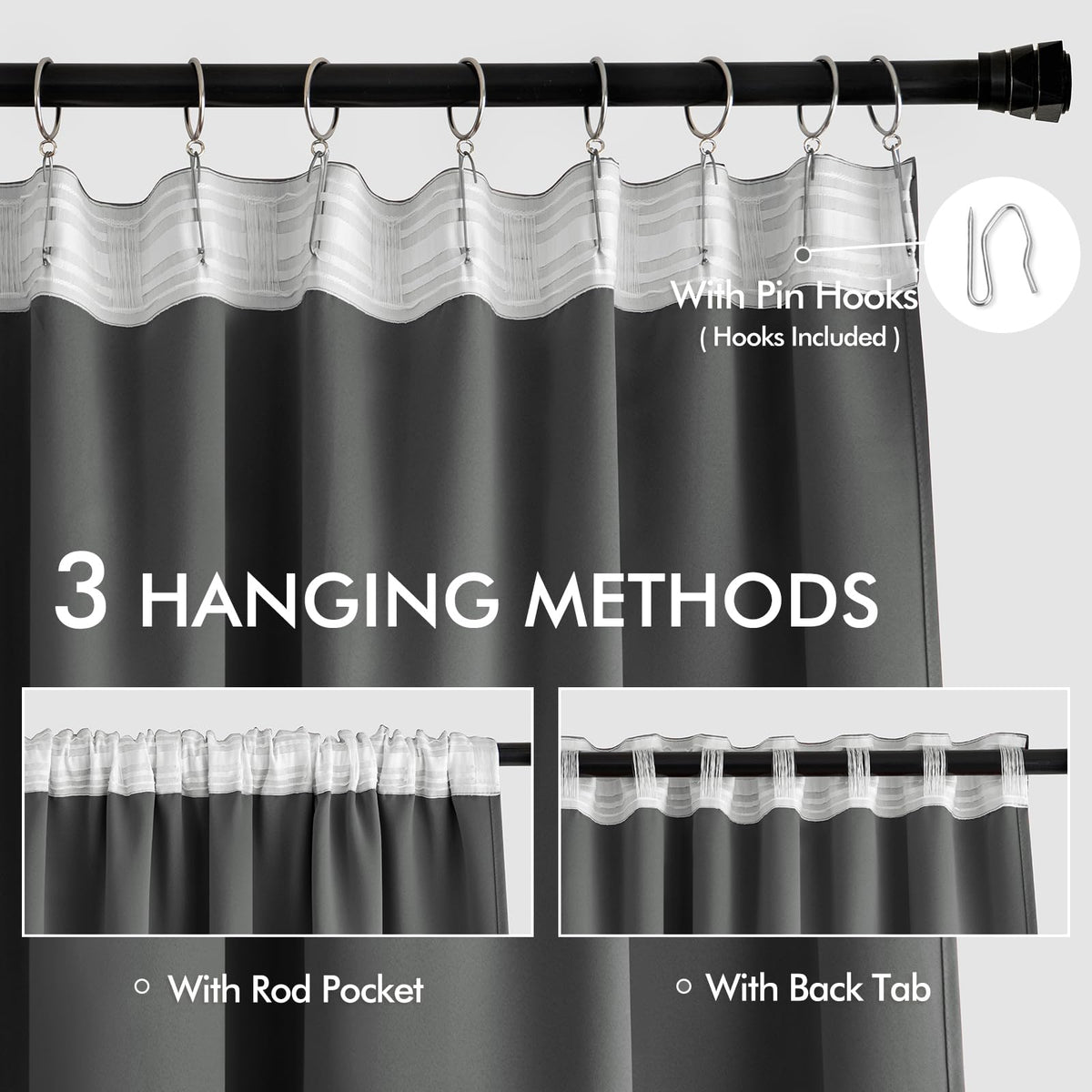 WELL MADE: Package includes 2 pcs high-quality blackout curtains. Each curtain panel measures 52 inches wide and 96 inches long. They can be easily matched with different decoration themes to give your room a modern and elegant style. MULTIPLE HANGING OPTIONS: Each panel features a 3-in-1 top style design: Rod Pocket, Back Tab and Pinch Pleat. The Back loop (2.3 'long) and rod pocket (3.1' long) fit most standard rods. Curtains also can be hung with clip rings or different type of hooks. We will GIVE AWAY 20 PIN HOOKS for each pair of curtains for your convenience (rings won't be included). PLEASE NOTE THAT FOR THE PLEAT HANGING METHOD, VISIBLE PLEATS CAN ONLY BE ACHIEVED BY USING 4 PRONG HOOKS, AND WE ONLY PROVIDE PIN HOOKS. LIGHT BLOCKING: Featuring triple weave stitching, these curtains can block 70%-80% of light and UV rays (dark colors work better). They can protect your furniture from fading and provide complete privacy and comfort for your nap or TV time. GOOD CHOICE: These durable and elegant curtain panels will bring a new and great look to your windows and rooms. Widely used in bedrooms, living rooms, patios, room dividers, functional and stylish. They still have top performance in terms of energy saving and noise reduction, while creating a ventilated and warm home scene. EASY CARE: Feel confident choosing MIULEE blackout curtains. Machine washable in cold water, gentle cycle, tumble dry, do not Bleach. Cool iron on face side if needed. Use steam iron on low heat from the back to remove creases/wrinkles.MIULEE TOUCH YOUR LIFE.