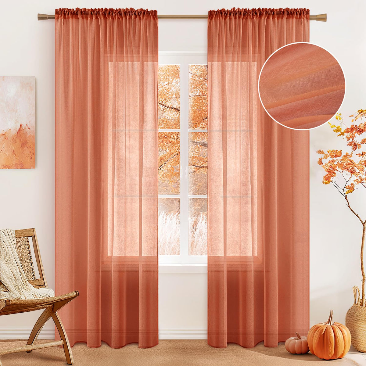 Miulee Burnt Orange Linen Textured Sheer Curtains 84 Inch Length For Bedroom/Living Room Semi Transparent Farmhouse Fall Decor Window Net Panels With Rod Pocket 2 Panels W 54 X L 84 Inches