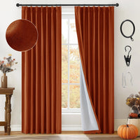 Q: What are the dimensions of the MIULEE Burnt Orange Pinch Pleated Curtains?A: Each panel measures 40 inches wide by 84 inches long, and the total width for two panels is 80 inches.