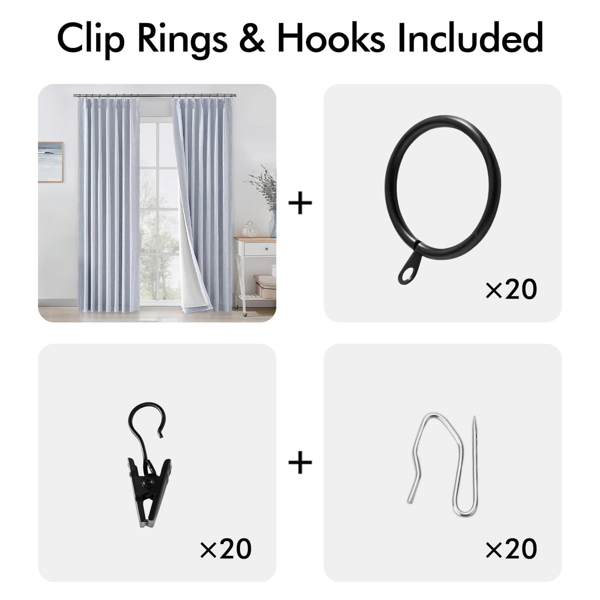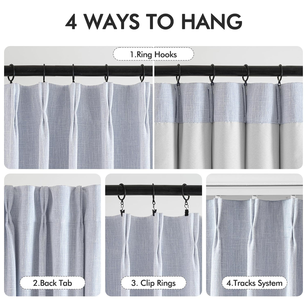 Q: What hanging options are available for these curtains?A: These curtains can be hung in multiple ways, including pinch pleated or back tab styles. They can be hung separately or together using curtain rings and hooks.