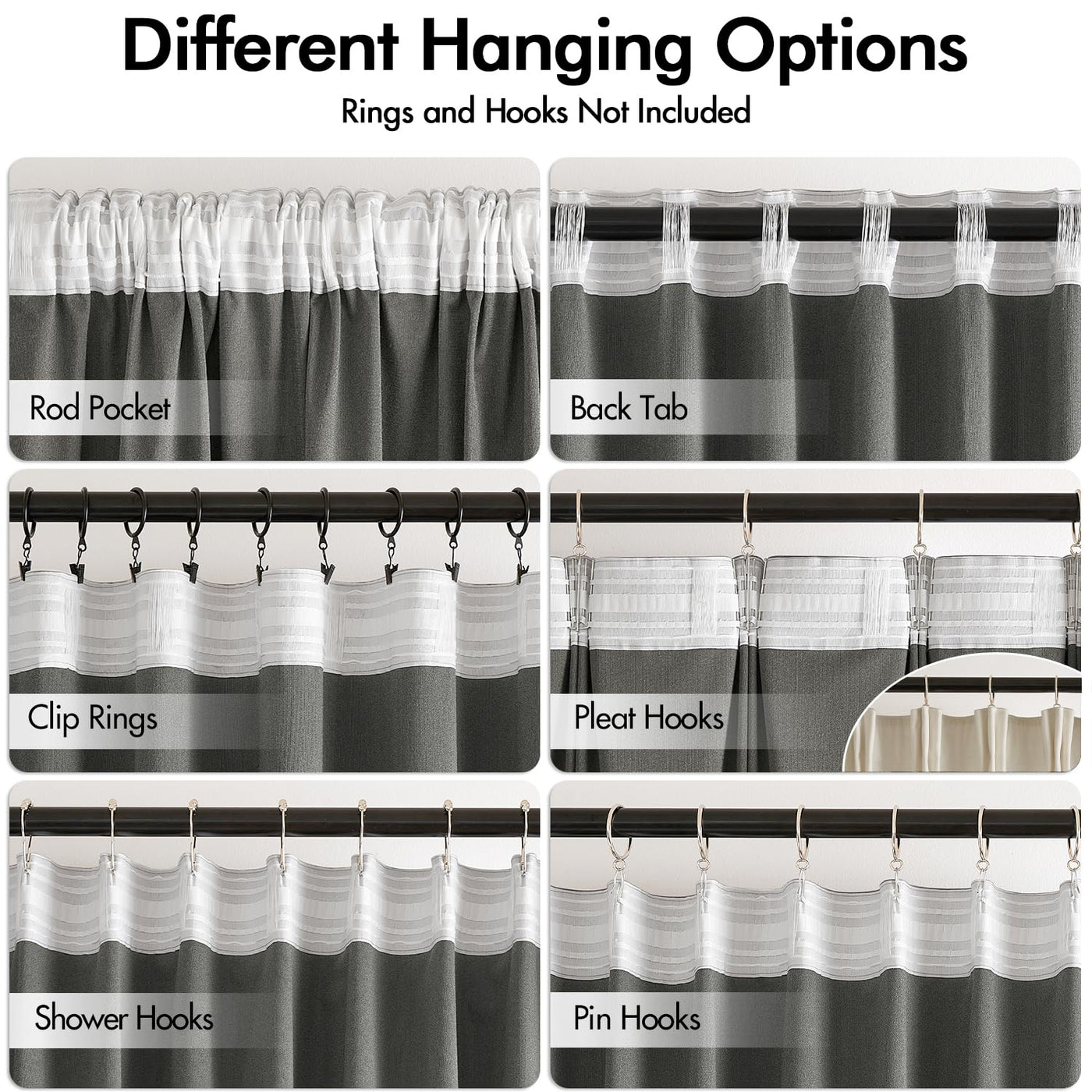 Q: What hanging options are available for these curtains?A: These curtains feature a 3-in-1 top style design, allowing you to hang them using a rod pocket, back tab, or pinch pleat. They can also be hung with clip rings or curtain hooks.