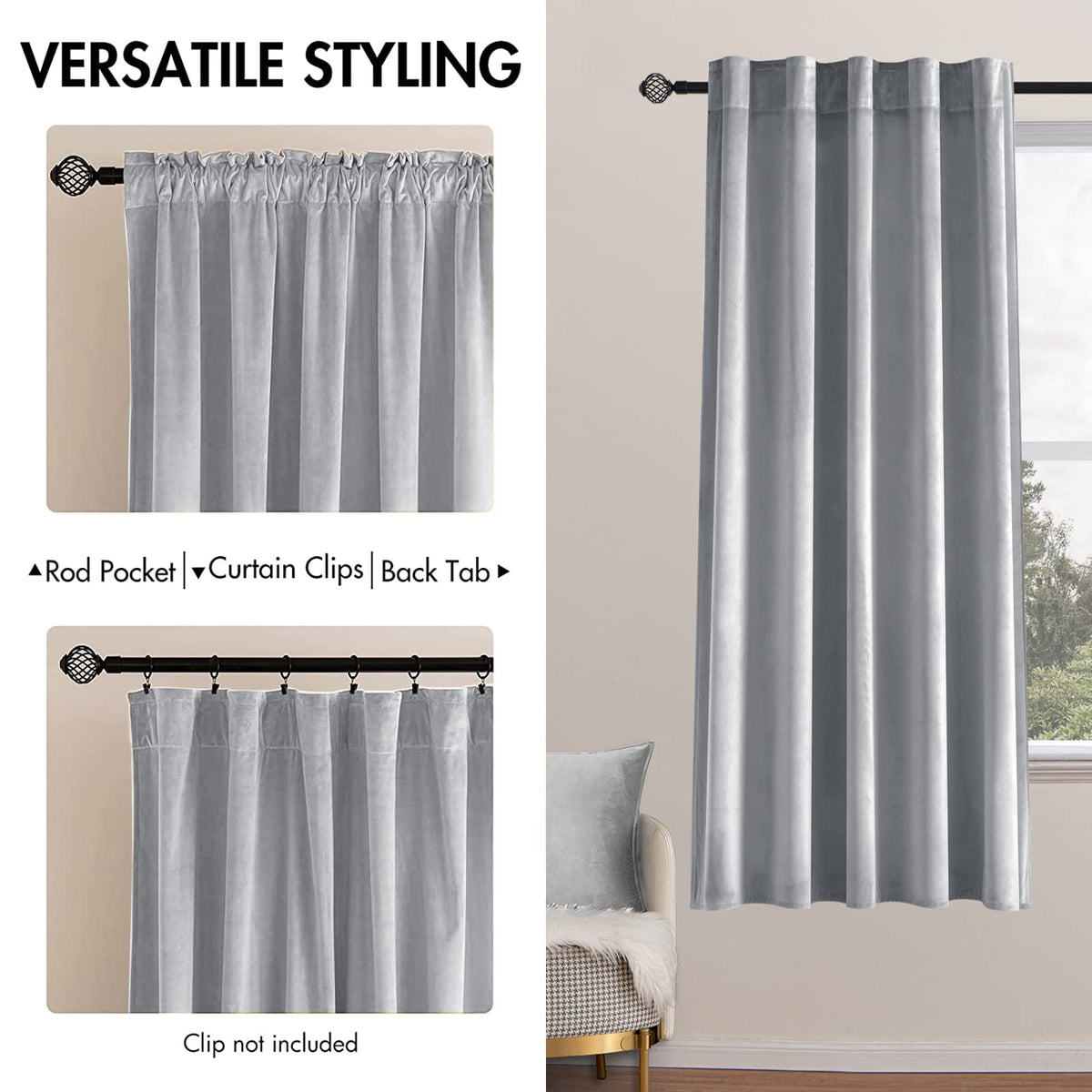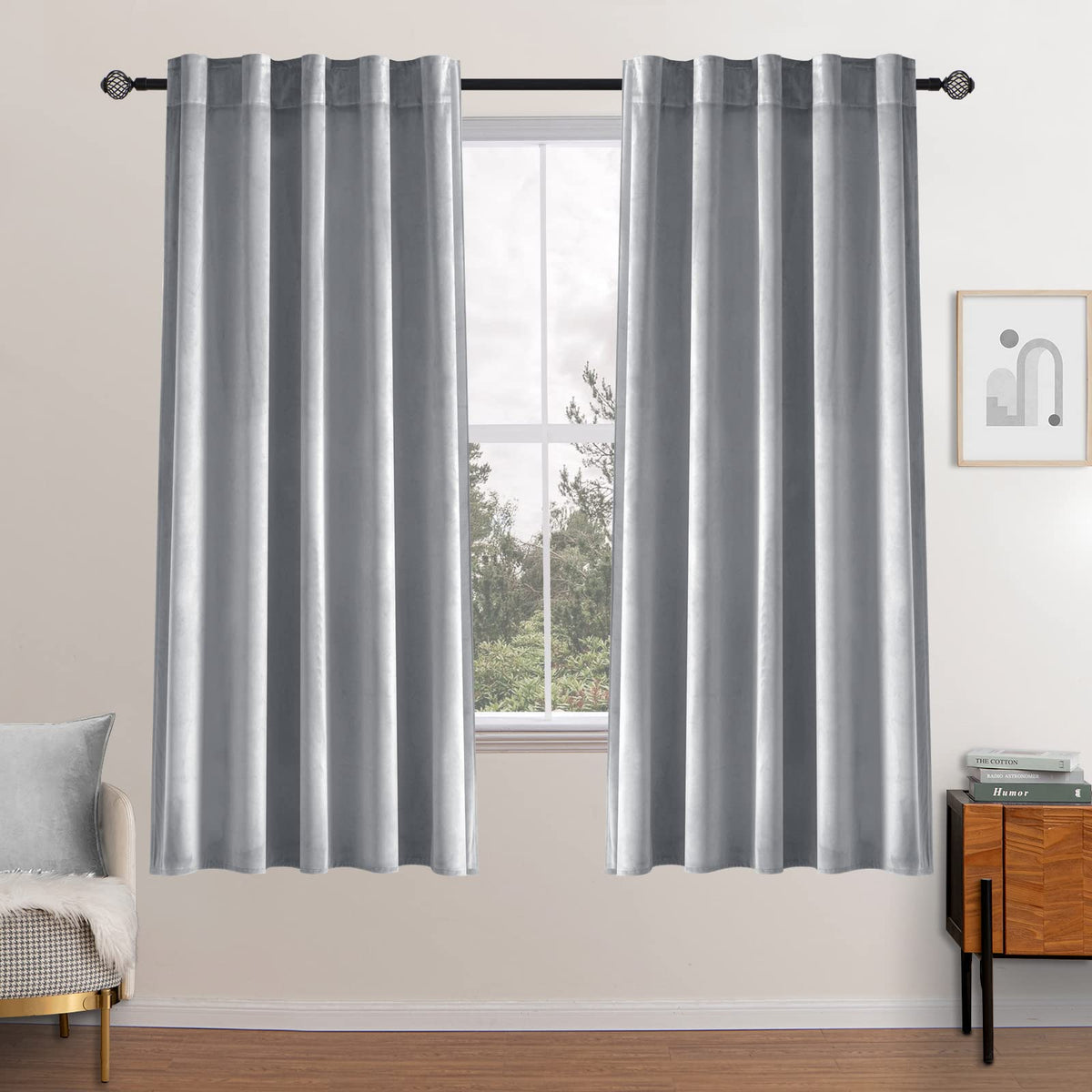 WELL MADE: Sold as 2 panels, each panel is W52' x L63', and W104' x L63' in total. Can be hung separately, or hung together with sheer curtains in MIULEE. HANGING OPTIONS: Each curtain panel has 2-in-1 top style design: rod pocket and back tab. With 3-inch inner diameter fit most standard rod. Curtains also can be hung with clip rings. 3 ways meet your various needs. LUXURY APPEARANCE: MIULEE velvet curtains are silky smooth, super soft, draped and heavyweight. They can be easily integrated into any style setting to make your room look more refined and elegant. FUNCTION: Craft from thick velvet, curtains can block 70-80% of the light (dark color works better). Also, these drapes can keep heat down in summer or keep cold out in winter to achieve smart energy saving. And these panels can provide privacy, reduce noise, which help to create a quiet sleeping environment EASY CARE: Machine washable in cold water, gentle cycle, tumble dry. Cool iron if needed. Use steam iron on low heat from the back to remove creases/wrinkles. Do Not Bleach.