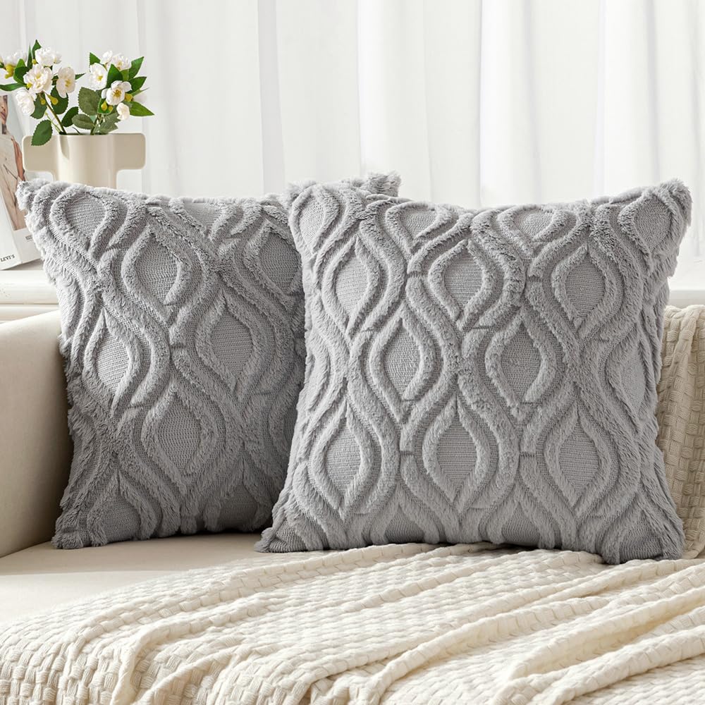 Miulee Light Grey Throw Pillow Covers 18X18 Inch, Soft Winter Plush Faux Wool Couch Pillow Covers Set Of 2 Decorative Farmhouse Boho Throw Pillows For Sofa Living Room Bed