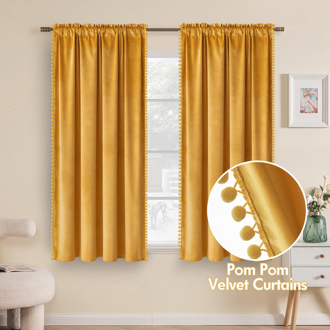 Miulee Mustard Yellow Pom Pom Velvet Curtains For Bedroom/Living Room Darkening Fall Thermal Insulating 63 Inches Long Blackout
