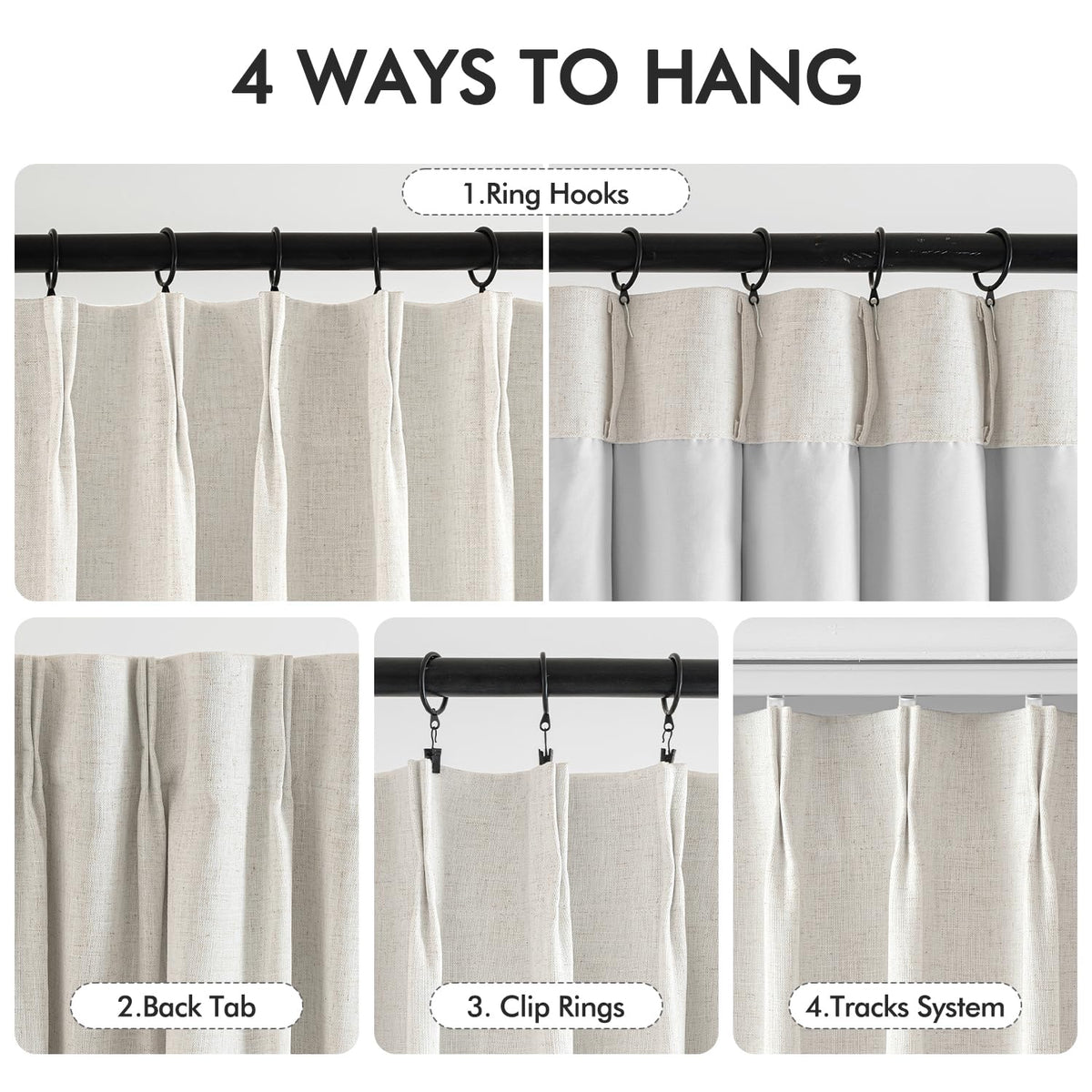 Q: Can these curtains be hung in different ways?A: Yes, the MIULEE curtains can be hung in multiple ways, including pinch pleated or back tab, allowing for versatile installation with curtain rings and hooks.