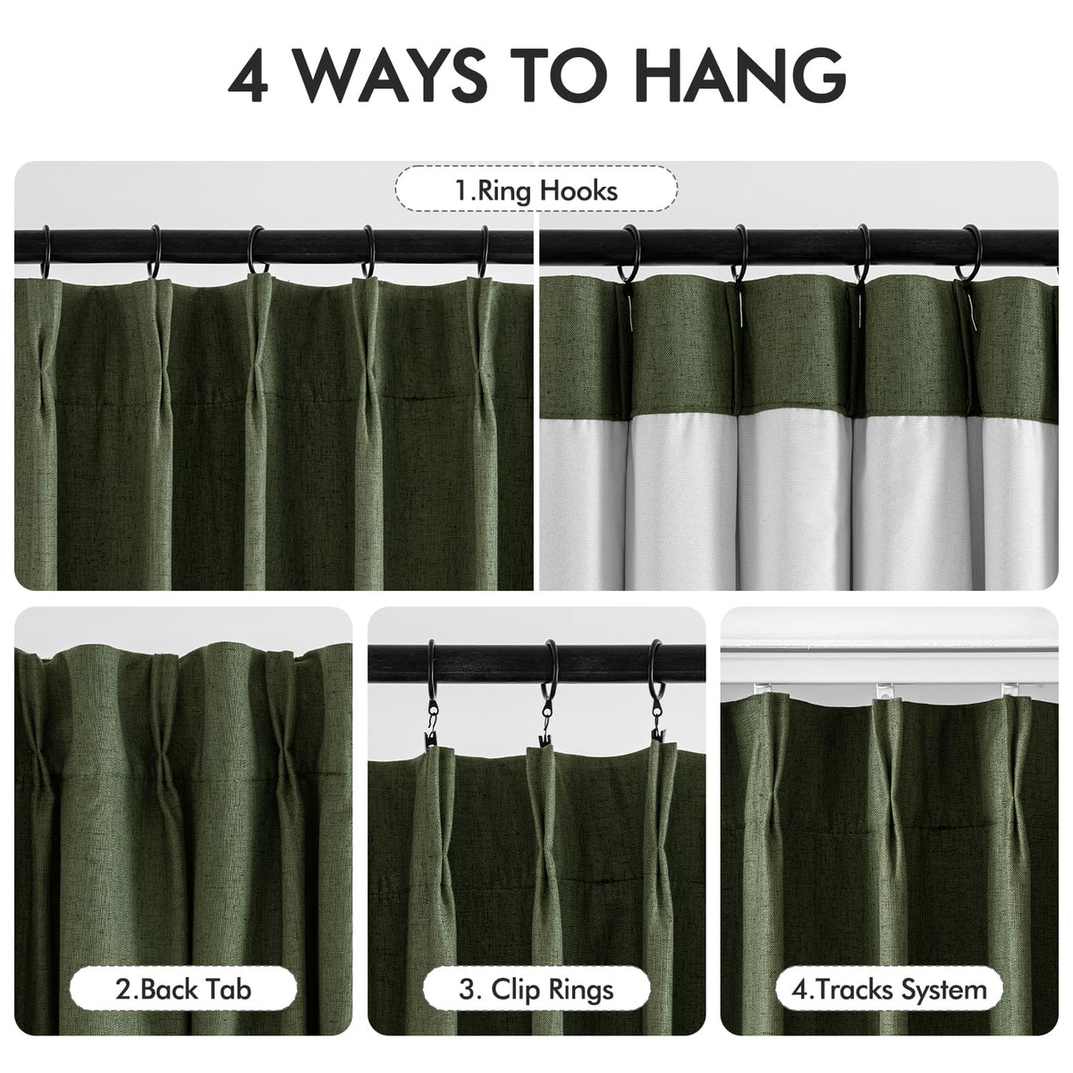 Q: What type of hanging options do the curtains offer?A: The MIULEE curtains can be hung in various ways, including pinch pleated and back tab. They can be hung separately or together on a track, using curtain rings and hooks.