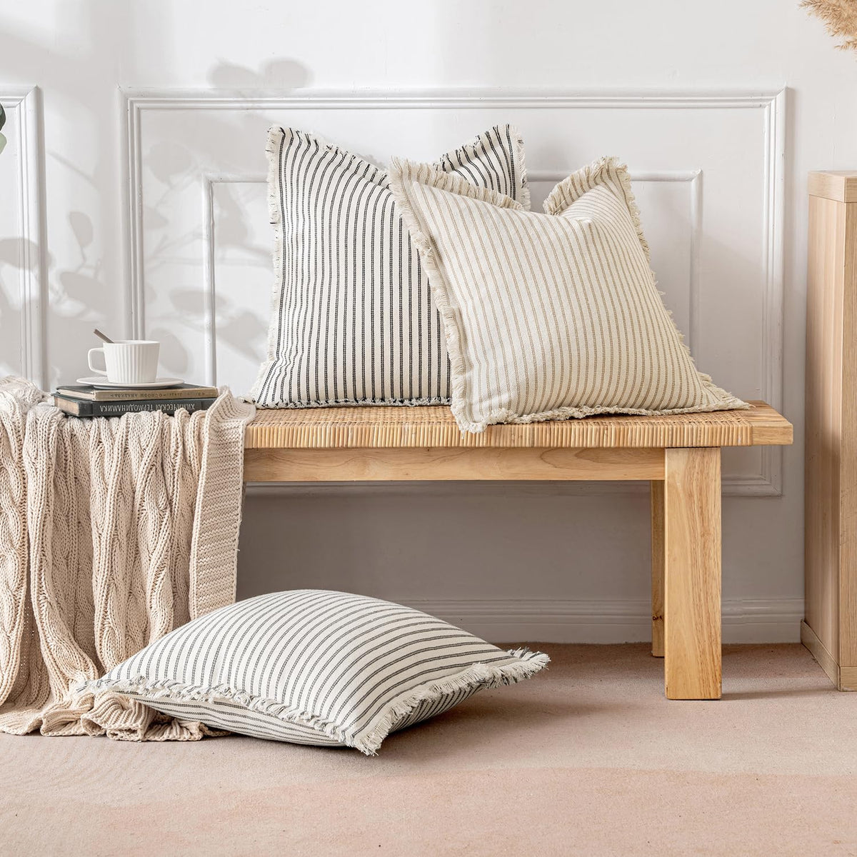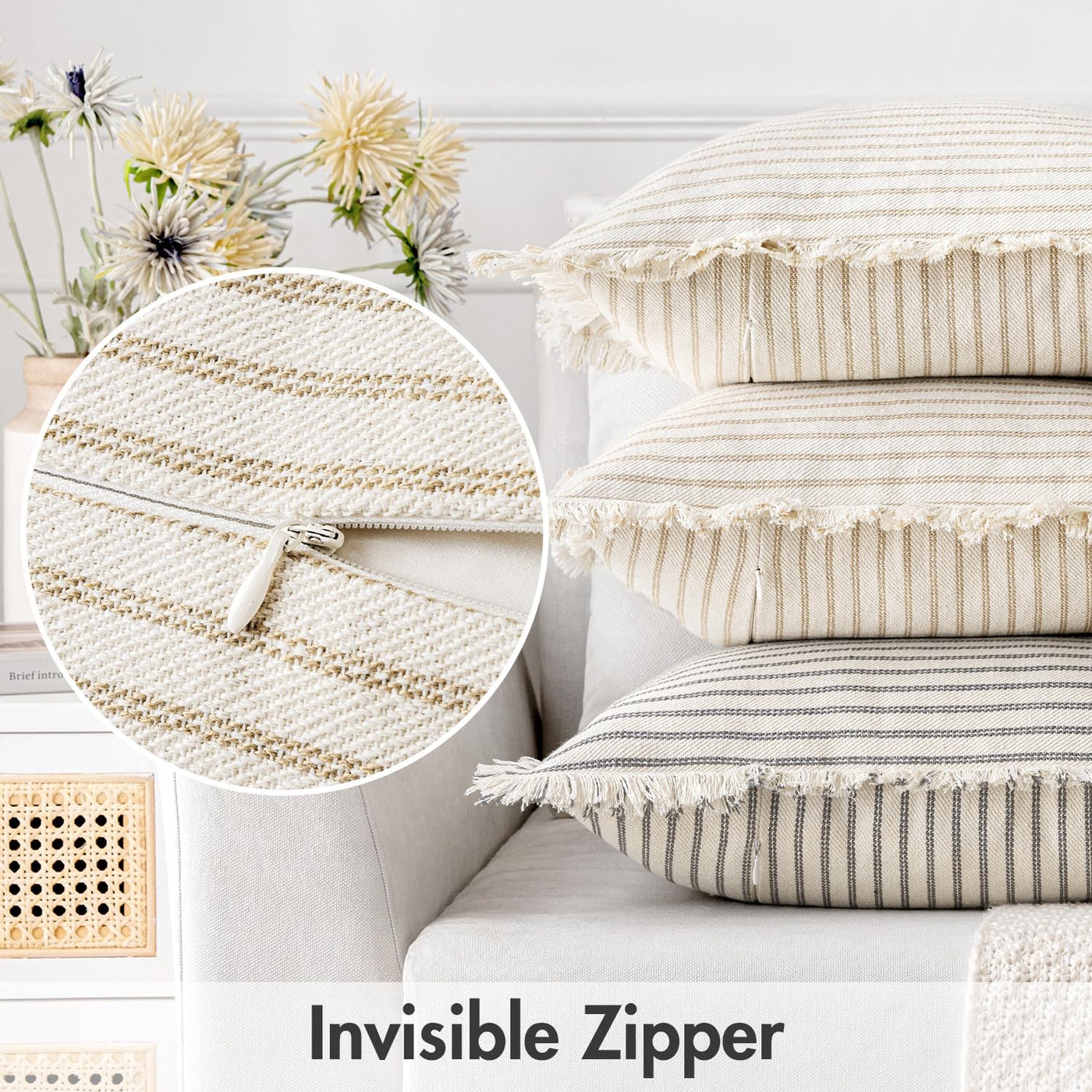 Miulee Pack Of 2 Khaki Pillow Covers 22X22 Inch Striped Farmhouse Couch Throw Pillow Covers With Fringe Chic Linen Decorative Cushion Covers For Sofa Living Room Bed Home Decor