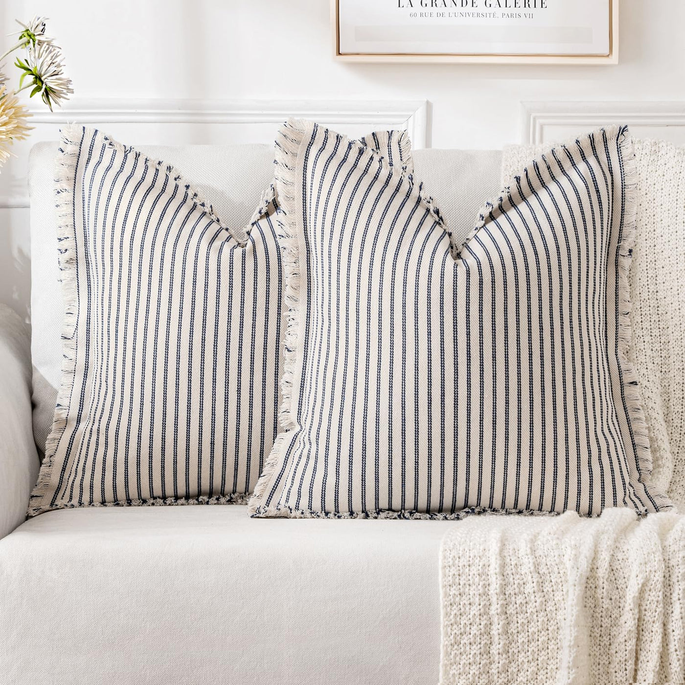 Miulee Pack Of 2 Navy Blue Pillow Covers 18X18 Inch Striped Farmhouse Couch Throw Pillow Covers With Fringe Chic Linen Decorativ