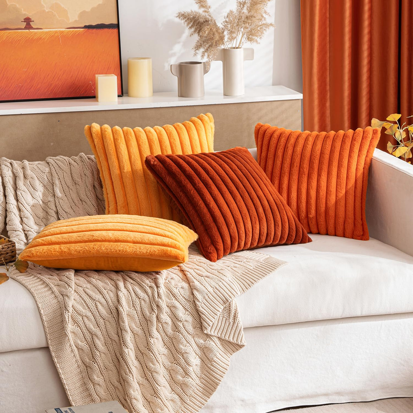 Material:The front of the pillow cover is fluffy and soft faux rabbit fur striped, velvet on the back. Double sided are smooth and cozy.