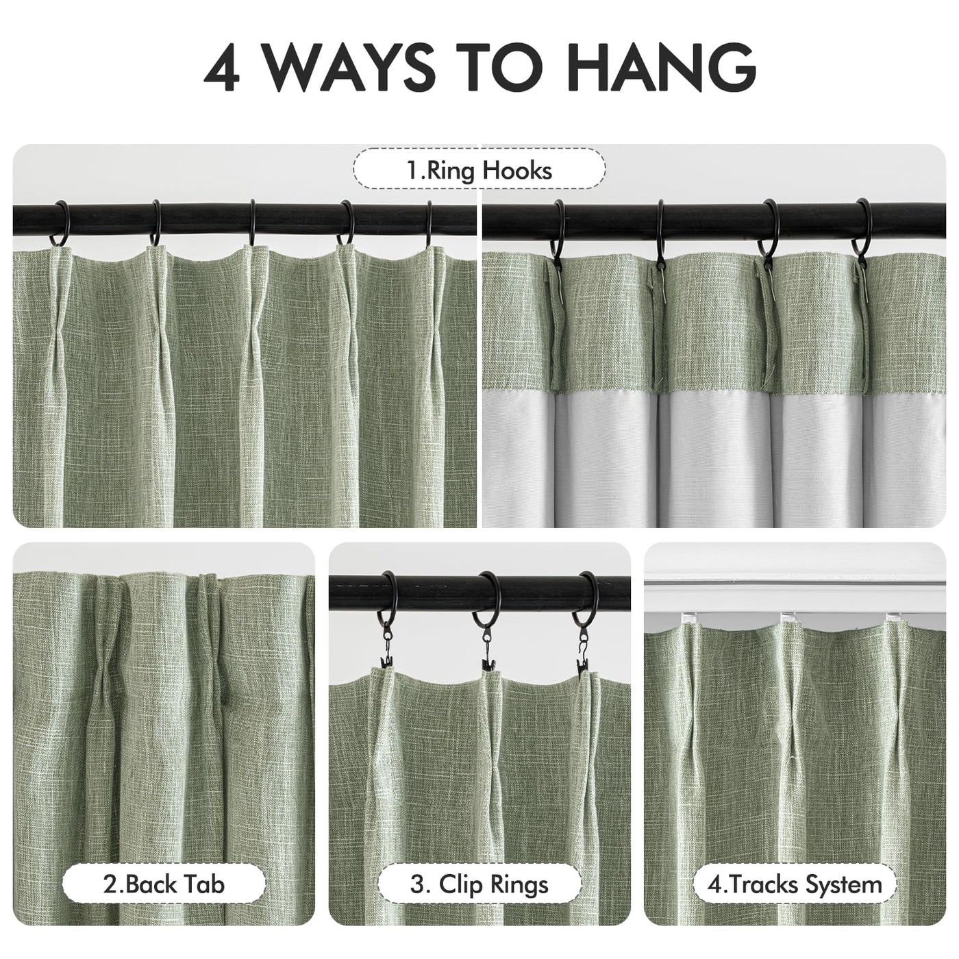 Q: Can these curtains be hung in different ways?A: Yes, the curtains can be hung in various ways, including pinch pleated and back tab styles. They can be used with curtain rings and hooks or on a track.
