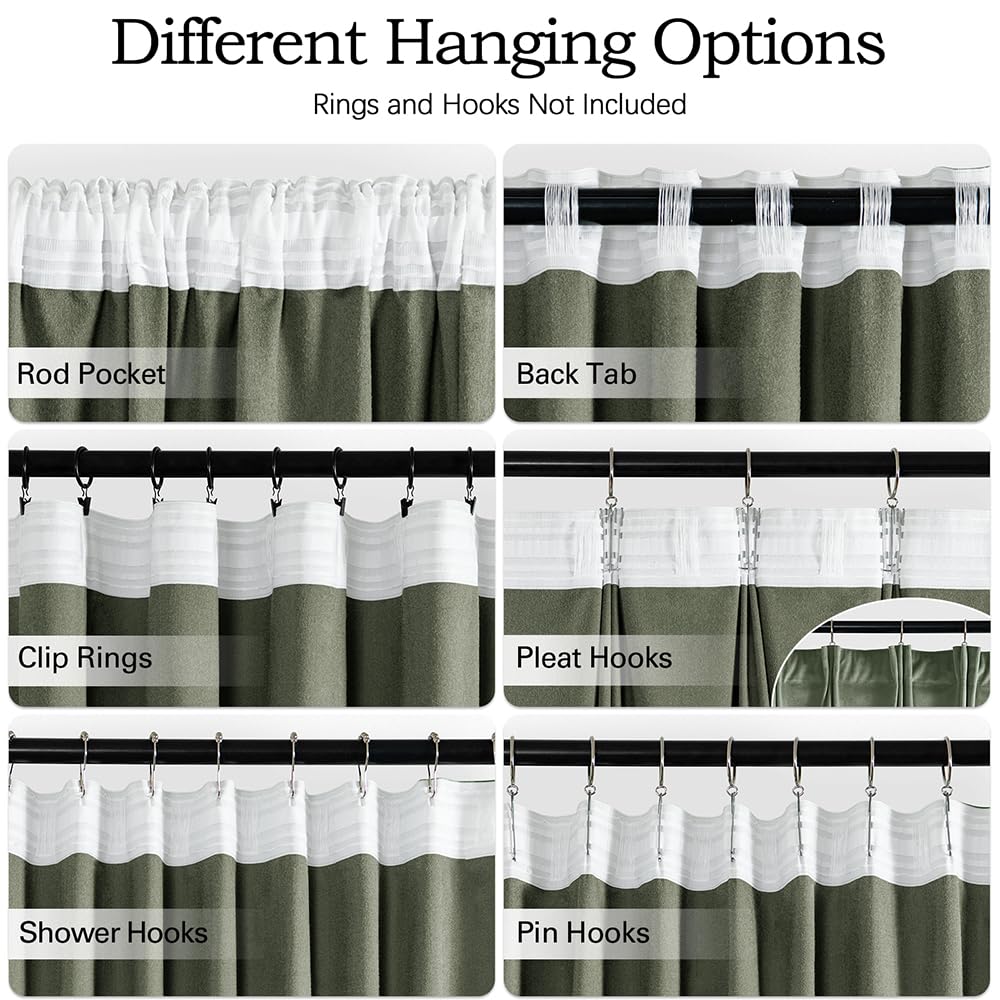 Q: What are the hanging options for these curtains?A: The curtains feature a versatile 3-in-1 top style design that allows for three hanging options: rod pocket, back tab, and pinch pleat. They can also be hung with clip rings or curtain hooks.