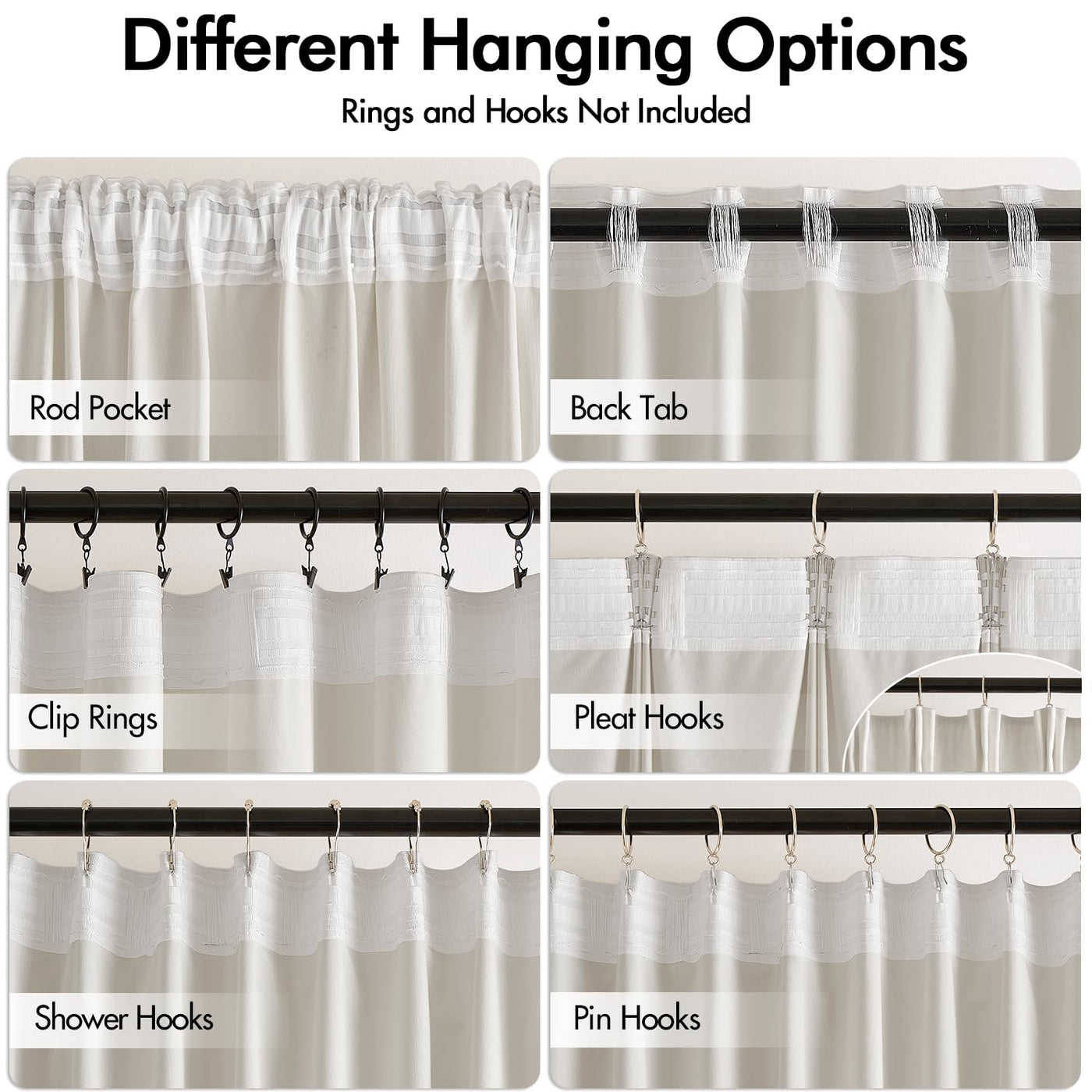 Q: What hanging options are available for these curtains?A: These curtains feature a 3-in-1 top style design, allowing for versatile hanging options: you can use the rod pocket, back tab, or pinch pleat styles. They can also be hung with clip rings or curtain hooks.