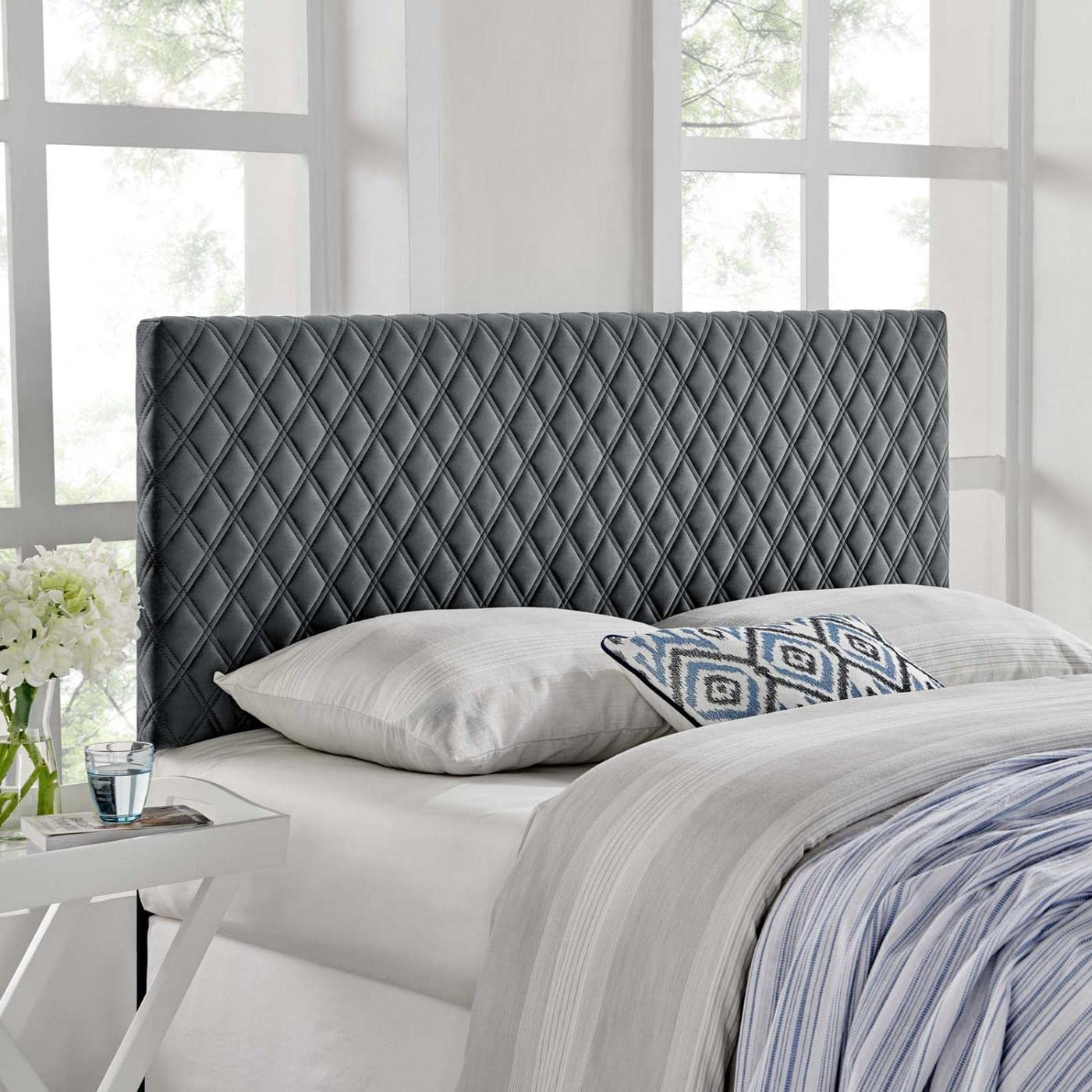 Customize your master suite or guest bedroom space with the Angela Tufted Diamond Lattice Performance Velvet Upholstered Full/Queen Headboard. The elegant textured diamond pattern combines with the soft and stain-resistant performance velvet upholstery for a standout headboard for full and queen size beds. The Angela Full/Queen Headboard is height adjustable with three mounting positions. Solidly constructed from wood and plywood, dense foam padding supports this headboard for a comfortable experience reading, reclining, or conversing in bed.FeaturesSet Includes: One - Angela Full/Queen Headboard Overall Product Dimensions: 3"L x 61.5"W x 22.5"HFloor to Top of Headboard: 42 - 50"HFloor to Bottom of Headboard: 19.5 - 27.5"H Color: Charcoal Material: MDF, LVL, Plywood, Fabric Material: 100% Polyster Assembly Required: Yes Made In Malaysia
