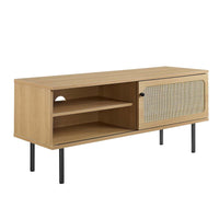 Bring trending organic aesthetics to your living space with the Cambria TV Stand. This entertainment center rests on cylindrical metal legs with non-marking foot caps and features a natural rattan weave along the front of the sliding door that partially conceals the shelving area. A versatile addition to a living room, bedroom, home office, or lounge area, this media console is crafted with durable particleboard and features two cable management holes that also allow for flow-through ventilation. Keep visual space clean with the ample storage space for media essentials. This entertainment stand accommodates flat screen TVs up to 52". Assembly required. Weight Limit: 150 lbs.Features:Materials: Rattan, particleboardFinish: OakSliding BoardNon-Marking Foot CapsCable Management HolesSpecifications:Product Dimensions: 20.5"H x 46.5"W x 15.5"DProduct Weight: 49 lbs