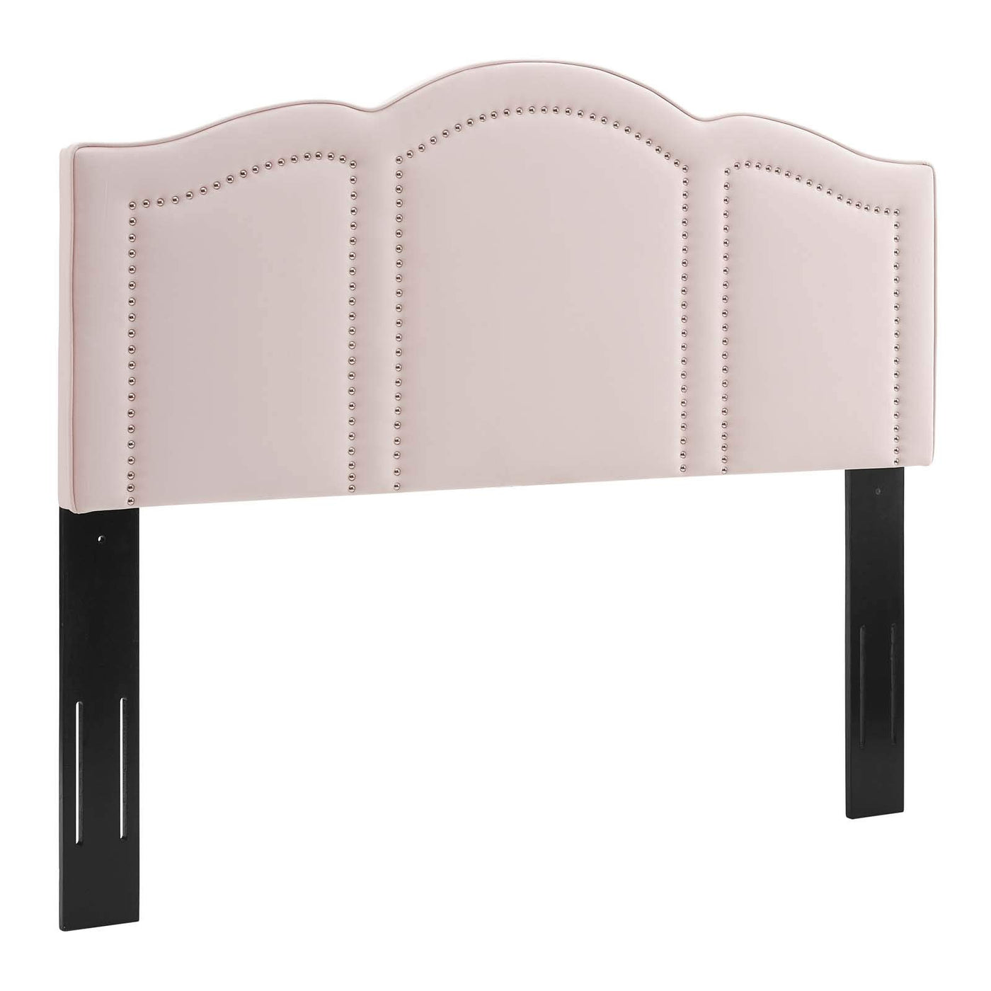 Reimagine the master bedroom or guest bedroom with the glam deco style of the Cecilia Performance Velvet King/California King Headboard. A focal point in the bedroom, this king/Cali king size headboard features classic nailhead trim creating arched window designs that pairs beautifully with its curved silhouette. Covered in soft, stain-resistant performance velvet, this upholstered headboard is padded in dense foam to offer supportive comfort while sitting up in bed reading, relaxing, or watching TV. The perfect backdrop for a variety of bedding and sham styles, this height-adjustable headboard fits king or California king size bed frames with its three mounting positions. Assembly required.