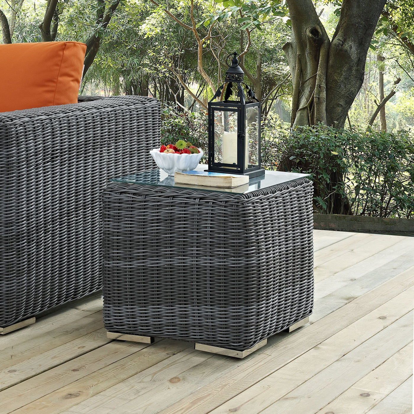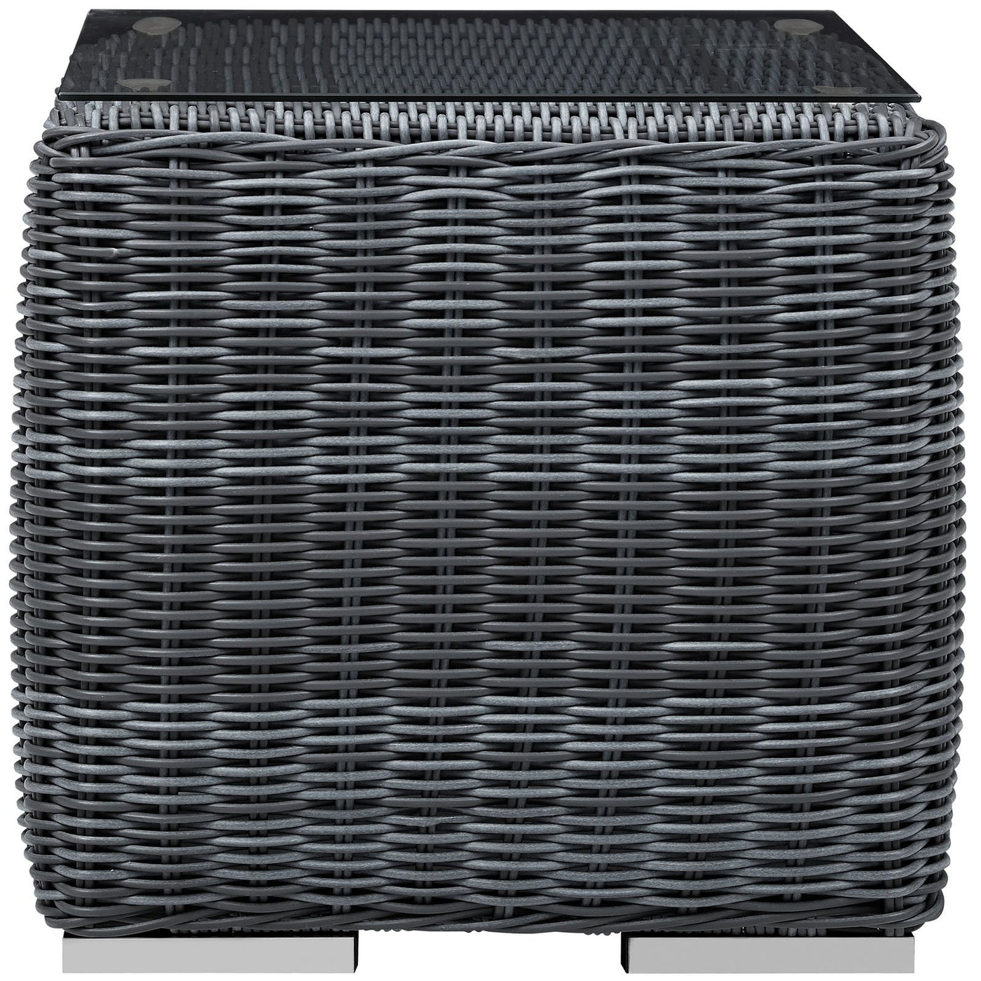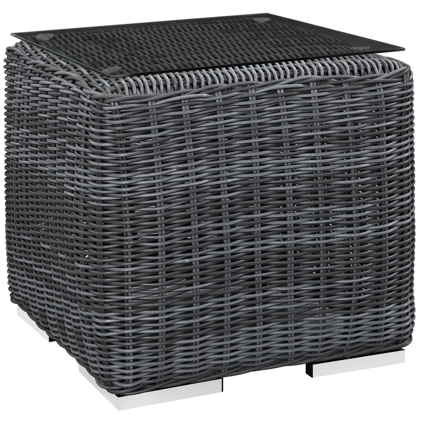 Experience the outdoors with exceptional comfort and quality. Summon Outdoor Patio Side End Table offers an exquisite two-tone synthetic rattan weave, UV protection, and a sturdy powder-coated aluminum frame. Featuring an elegant modern look, Summon Outdoor Side Table is part of an avant-garde outdoor sectional series well-equipped for enhancing patio, backyard, or poolside gatherings. This installment of the series is an Outdoor Patio Side End Table.