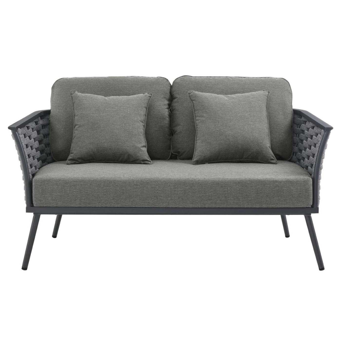 Gather family and friends for pleasant weather and good conversation with the Stance Outdoor Collection. Boasting a contemporary modern look, Stance features woven polyester fabric rope seat back and flared powder-coated aluminum frame, while waterproof all-weather fabric cushions with dense foam padding provide a relaxing spot to lounge. A versatile set designed for long-lasting durability, each piece in the Stance Collection can be mixed and matched and effortlessly arranged to fit the spontaneous needs of you and your guests. Loveseat Weight Capacity: 440 lbs. Set Includes: One - Stance Loveseat Product Dimensions: Overall Product Dimensions: 32"L x 55"W x 31.5"H Seat Dimensions: 21"L x 50.5"W x 15.5"H Seat Cushion Dimensions: 27.5"L x 47"W x 5"H Backrest Cushion Dimensions: 23.5"L x 17.5"W