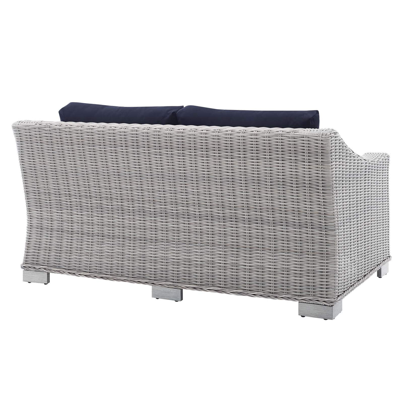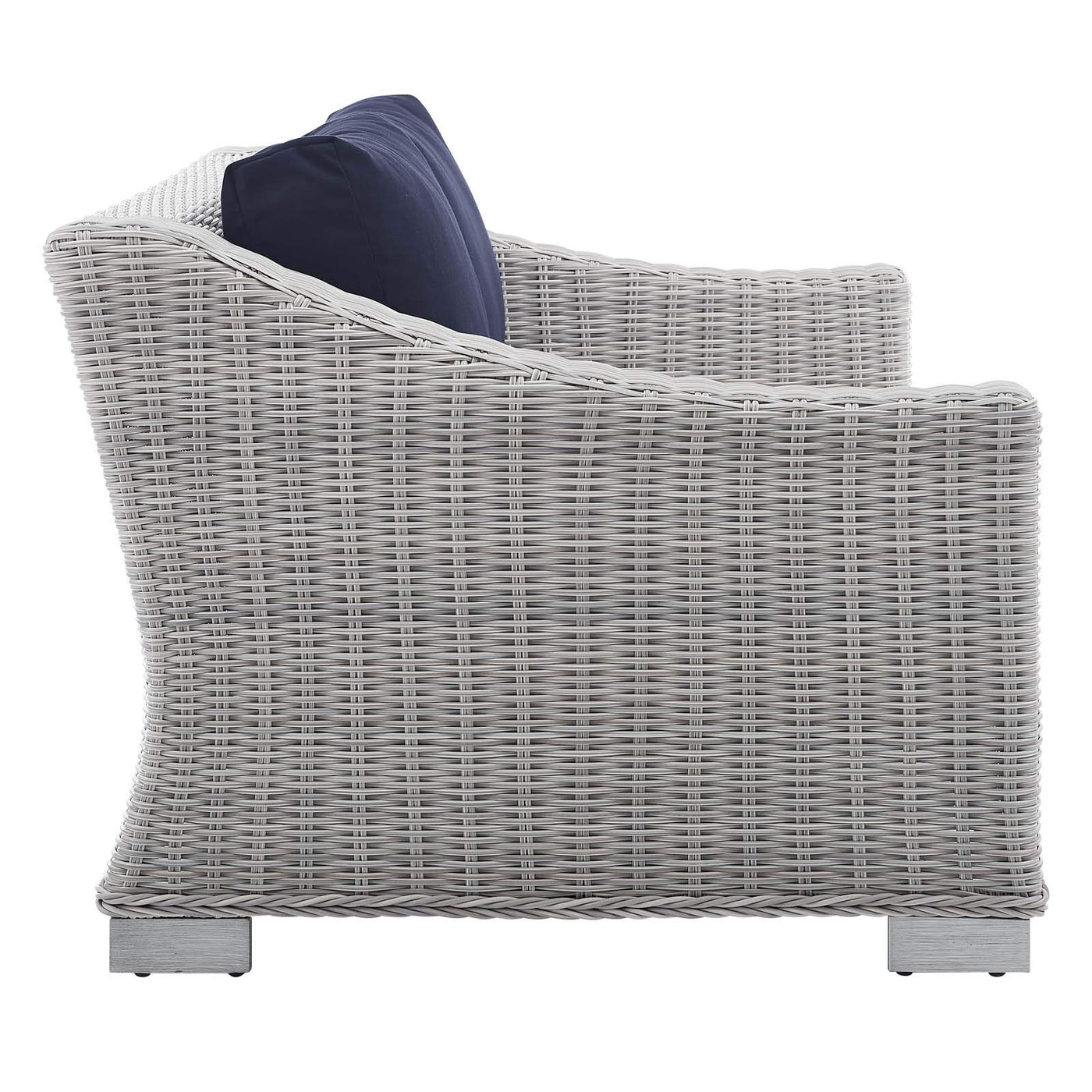 Enjoy Fresh Air And Alfresco Relaxation With The Conway Outdoor Patio Wicker Rattan Loveseat. Wrapped In Uv-Resistant Light Gray Synthetic Wicker Rattan, This Patio Loveseat Boasts Organic Texture And A Neutral Hue That Brings A Calming Presence To Your Outdoor Space. The Frame Of This Outdoor Two-Seater Sofa Is Crafted With Durable Powder-Coated Aluminum And Rests On L-Shaped Legs With Plastic Foot Glides. Thick Foam Padded Cushions Covered With Washable Water-Resistant Sunbrella® Fabric Covers Offer A Comfortable Seat And Affix Securely To The Loveseat With Cord Tension Attachments. Trending Aesthetics And A Classic Design Define This Outdoor Patio Furniture Collection Making It A Beautiful Addition To Any Outdoor Space Including The Backyard, Patio, Porch, Balcony, Or Poolside. Assembly Required. Patio Loveseat Weight Capacity: 600 Lbs. Set Includes: One - Conway Loveseat Product Dimensions: Overall Product Dimensions: 36"L X 55"W X 28"H Seat Dimensions: 22.5"L X 44"W X 15"H Backrest Dimensions: 5"L X 44"W X 12"H Armrest Height: 21"H Cushion Thichkness: 5"H