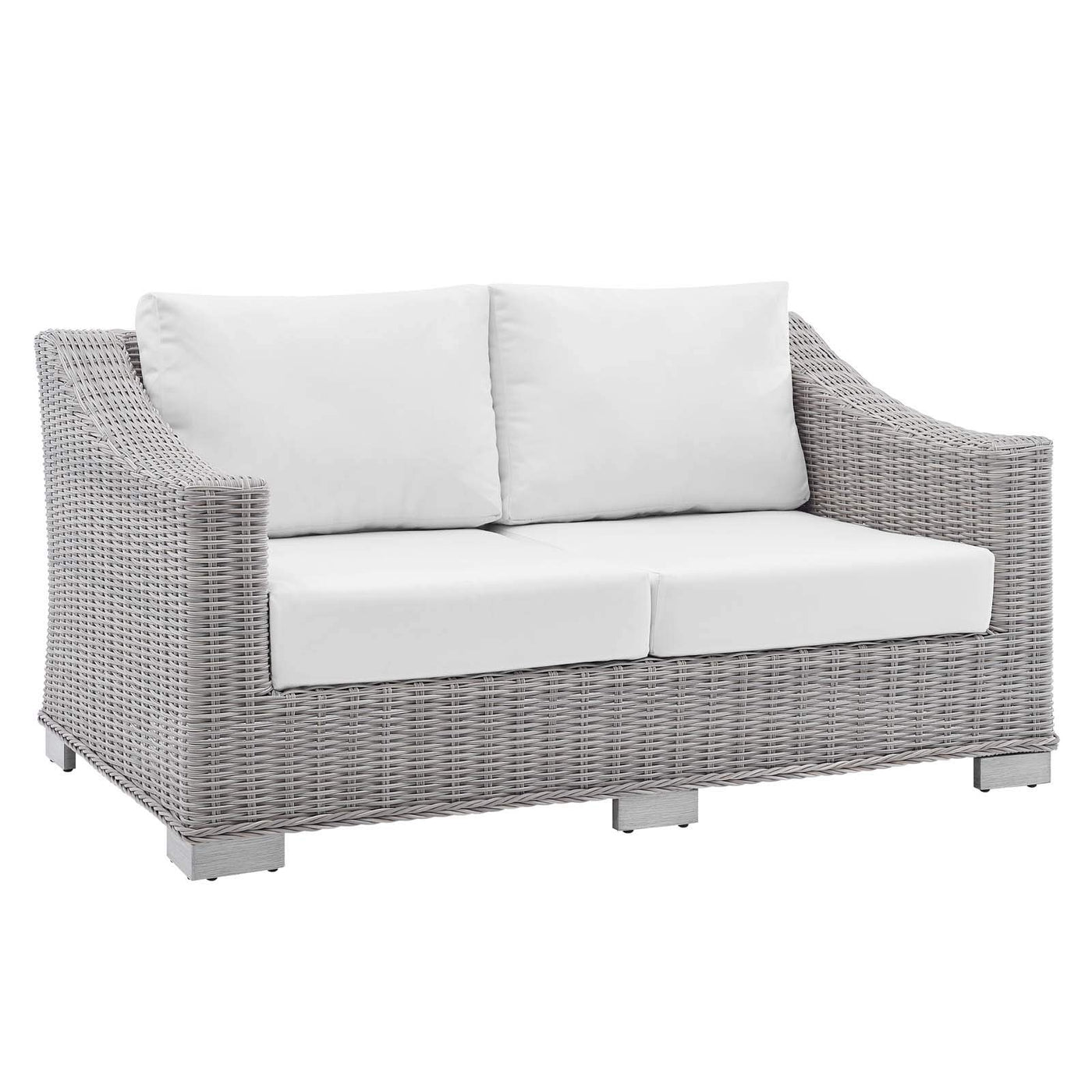 Enjoy Fresh Air And Alfresco Relaxation With The Conway Outdoor Patio Wicker Rattan Loveseat. Wrapped In Uv-Resistant Light Gray Synthetic Wicker Rattan, This Patio Loveseat Boasts Organic Texture And A Neutral Hue That Brings A Calming Presence To Your Outdoor Space. The Frame Of This Outdoor Two-Seater Sofa Is Crafted With Durable Powder-Coated Aluminum And Rests On L-Shaped Legs With Plastic Foot Glides. Thick Foam Padded Cushions Covered With Washable Water-Resistant Sunbrella® Fabric Covers Offer A Comfortable Seat And Affix Securely To The Loveseat With Cord Tension Attachments. Trending Aesthetics And A Classic Design Define This Outdoor Patio Furniture Collection Making It A Beautiful Addition To Any Outdoor Space Including The Backyard, Patio, Porch, Balcony, Or Poolside. Assembly Required. Patio Loveseat Weight Capacity: 600 Lbs. Set Includes: One - Conway Loveseat Product Dimensions: Overall Product Dimensions: 36"L X 55"W X 28"H Seat Dimensions: 22.5"L X 44"W X 15"H Backrest Dimensions: 5"L X 44"W X 12"H Armrest Height: 21"H Cushion Thichkness: 5"H