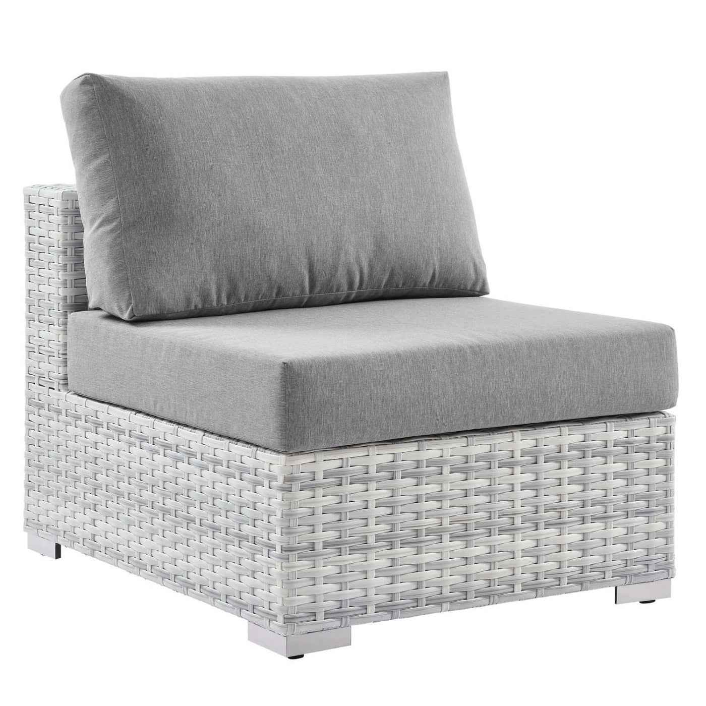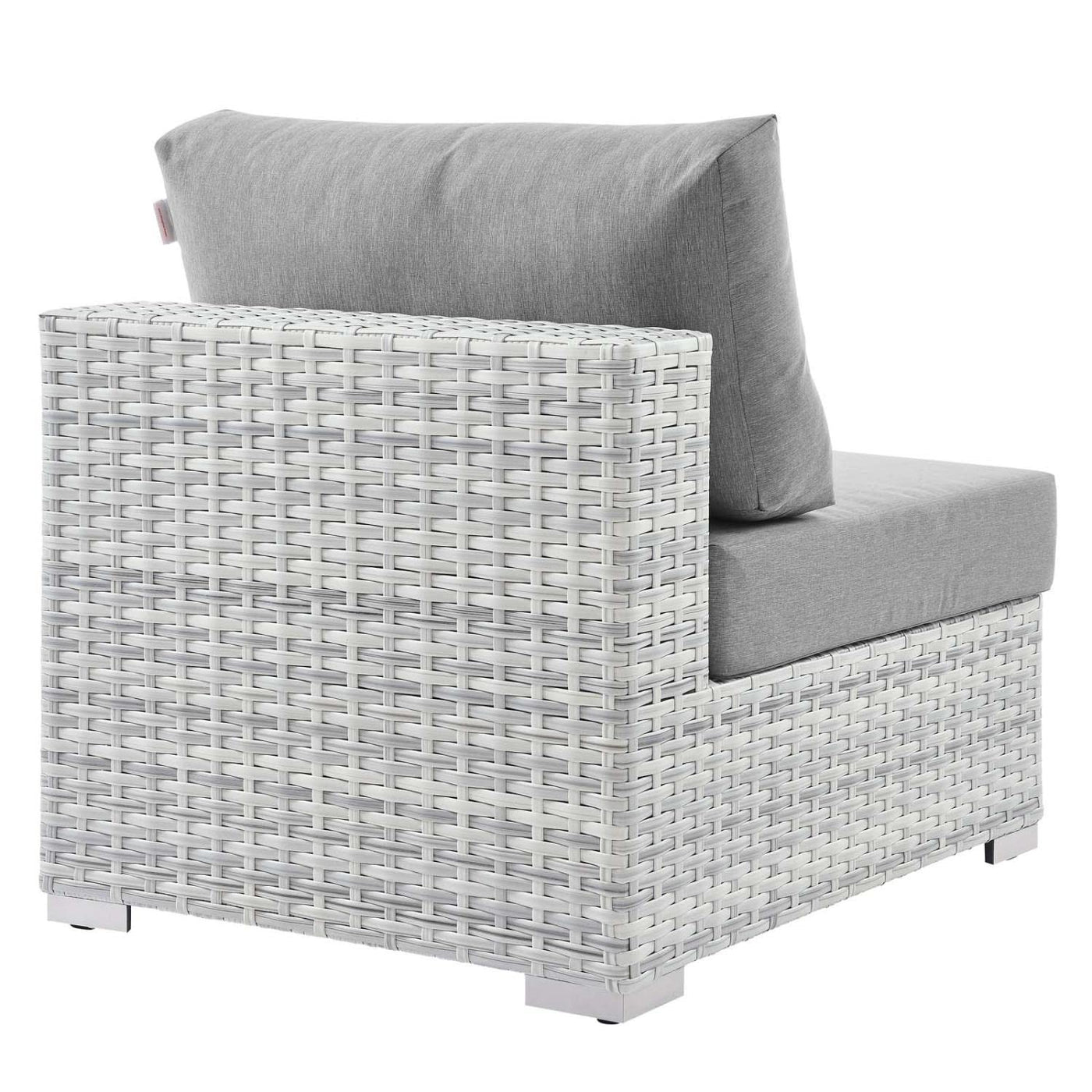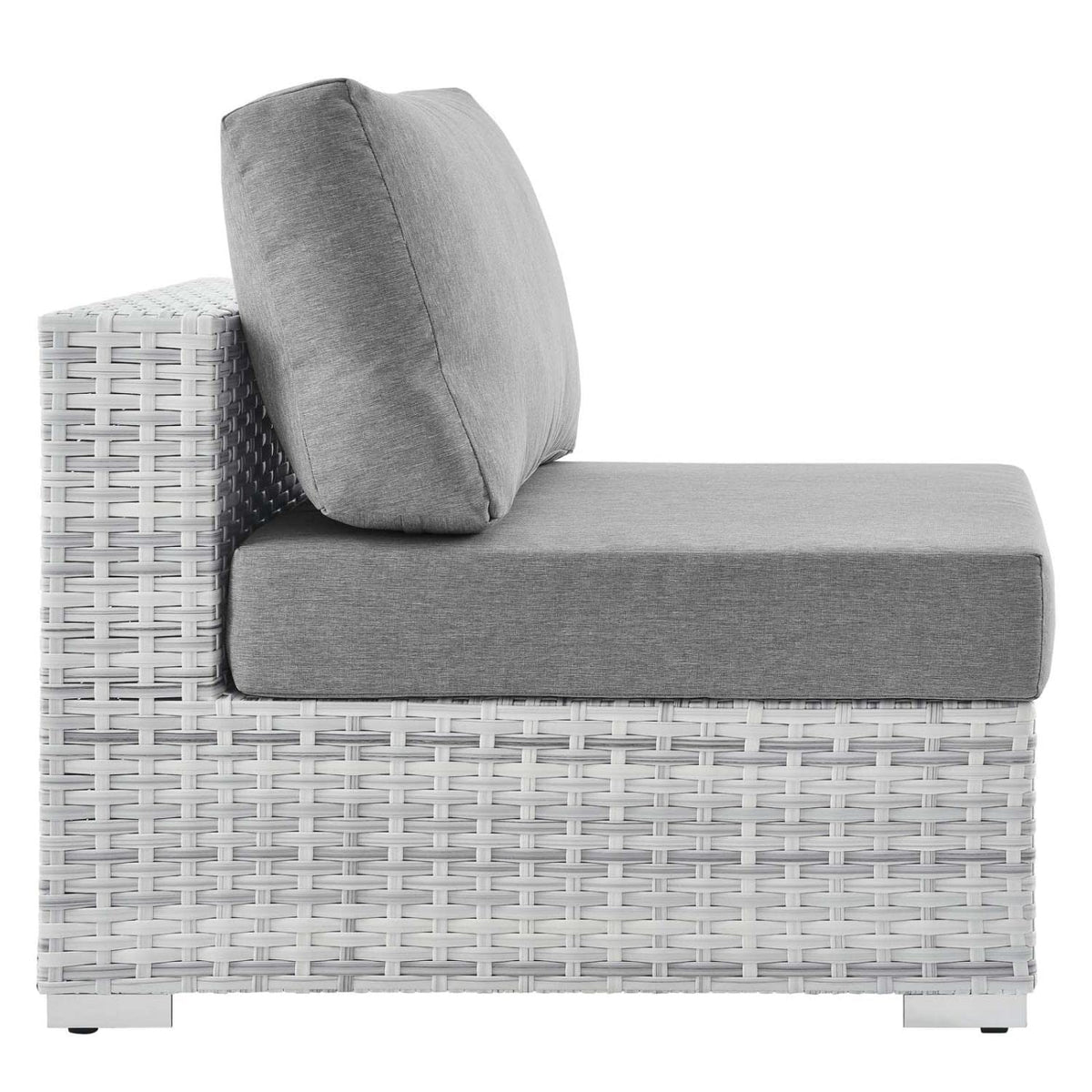 Gather stages of sensitivity with the Convene Outdoor Sectional series. Made with a synthetic rattan weave and a powder-coated aluminum frame, Convene is a versatile patio armless chair from an outdoor collection that shifts and combines according to the spontaneous needs of the moment. Outfitted with all-weather fabric cushions, the Convene Armless Chair leaves a positive impression on friends and family while enhancing your patio, backyard, or poolside retreat with palpable distinction. Set Includes: One - Convene Armless Chair Product Dimensions: Overall Product Dimensions: 35"L x 28.5"W x 33"H Seat Dimensions: 22.5"L x 28.5"W x 17.5"H Armrest Height from Seat: 8"H Backrest Dimensions: 6"L x 28.5"W x 15.5"H Cushion Thichkness: 5"H