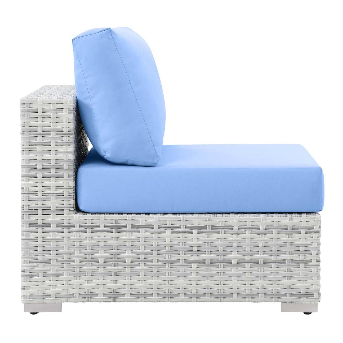 Gather stages of sensitivity with the Convene Outdoor Sectional series. Made with a synthetic rattan weave and a powder-coated aluminum frame, Convene is a versatile patio armless chair from an outdoor collection that shifts and combines according to the spontaneous needs of the moment. Outfitted with all-weather fabric cushions, the Convene Armless Chair leaves a positive impression on friends and family while enhancing your patio, backyard, or poolside retreat with palpable distinction. Set Includes: One - Convene Armless Chair Product Dimensions: Overall Product Dimensions: 35"L x 28.5"W x 33"H Seat Dimensions: 22.5"L x 28.5"W x 17.5"H Armrest Height from Seat: 8"H Backrest Dimensions: 6"L x 28.5"W x 15.5"H Cushion Thichkness: 5"H