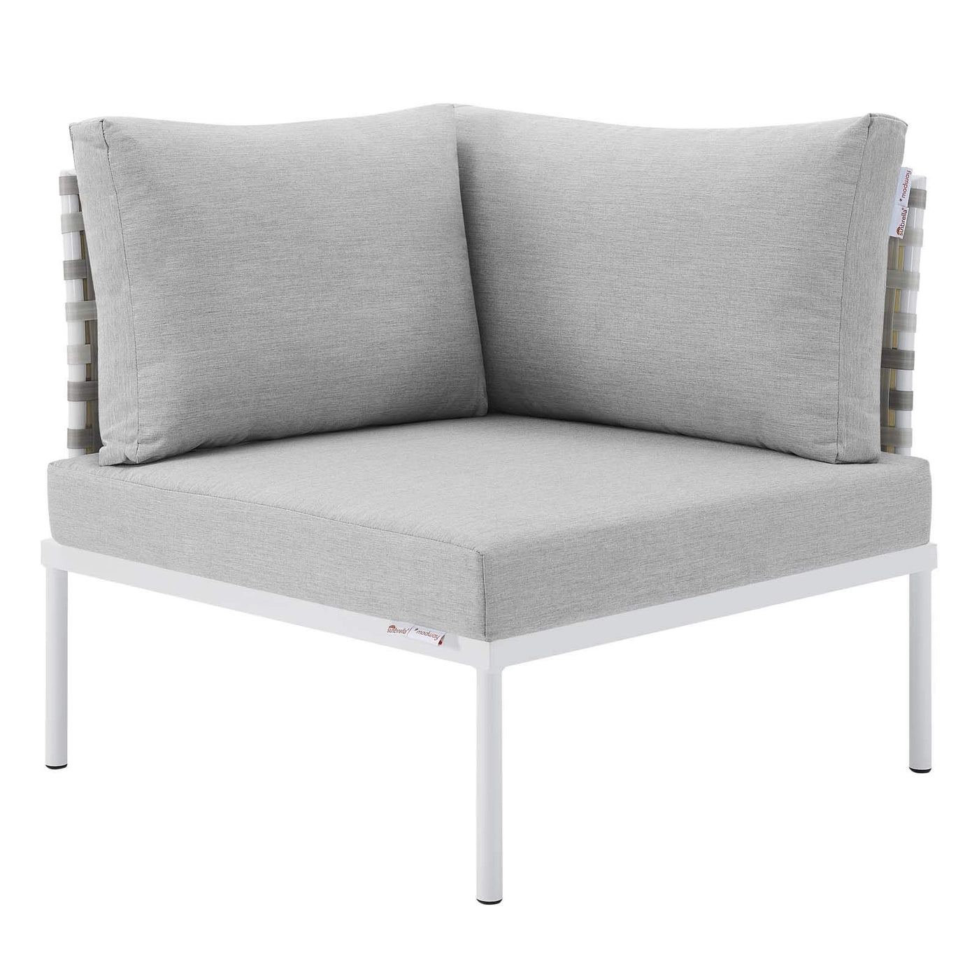 Engage life with Harmony Outdoor Patio Corner Chair. Enjoy casual conversation under the open sky with an all-weather waterproof outdoor sofa chair from a versatile furniture set that delivers an exceptional outdoor porch, patio, balcony or garden experience. An exceptional modern outdoor furniture set that exceeds expectations, Harmony Patio Corner Chair comes with synthetic rattan seat back weave, square powder coated aluminum bases, Sunbrella® cushions, and non-marking foot caps. An outside sectional corner chair that arranges according to the spontaneous needs of your guests, set your sights on open and inspired moments with the Harmony Outdoor Patio Collection. Set Includes: One - Harmony Basket Weave Corner Chair Product Dimensions: Overall Product Dimensions: 33"L x 33"W x 32"H Seat Dimensions: 30.5"L x 30.5"W x 15.5"H Cushion thickness: 4.5"H