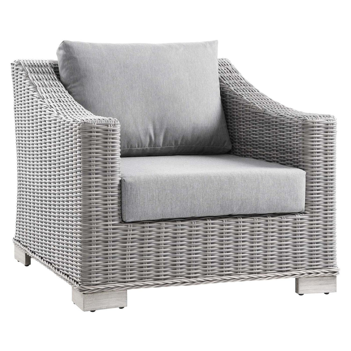 Enjoy fresh air and alfresco relaxation with the Conway Outdoor Patio Wicker Rattan Armchair. Wrapped in UV-resistant light gray synthetic wicker rattan, this patio chair boasts organic texture and a neutral hue that brings a calming presence to your outdoor space. The frame of this outdoor chair is crafted with durable powder-coated aluminum and rests on L-shaped legs with plastic foot glides. Thick foam padded cushions covered with removable, water-resistant polyester covers offer a comfortable seat and affix securely to the lounge chair with cord tension attachments. Trending aesthetics and a classic design define this outdoor patio furniture collection making it a beautiful addition to any outdoor space including the backyard, patio, porch, balcony, or poolside. Assembly required. Patio Chair Weight Capacity: 300 lbs. Set Includes: One - Conway Armchair Product Dimensions: Overall Product Dimensions: 36"L x 32"W x 28"H Seat Dimensions: 22.5"L x 22"W x 15"H Backrest Dimensions: 10"L x 22"W x 12"H Armrest Dimensions: 22.5"L x 5"W x 6"H Base Dimensions: 33.5"L x 31.5"W