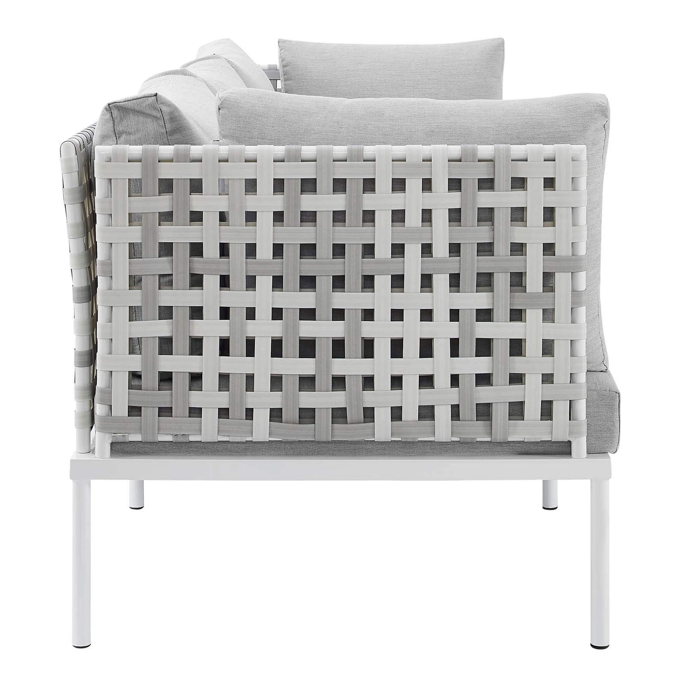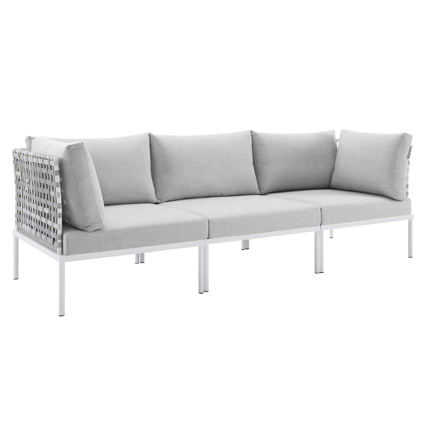 Engage life with Harmony Outdoor Patio Sofa. Enjoy casual conversation under the open sky with an all-weather waterproof outdoor sofa from a versatile furniture set that delivers an exceptional outdoor porch, patio, balcony or garden experience. An exceptional modern outdoor furniture set that exceeds expectations, Harmony Patio Three-Seat Sofa comes with synthetic rattan seat back weave, square powder coated aluminum bases, Sunbrella® cushions, and non-marking foot caps. An outside couch that arranges according to the spontaneous needs of your guests, set your sights on open and inspired moments with the Harmony Outdoor Patio Collection. Set Includes: One - Harmony Basket Weave Sofa Product Dimensions: Overall Product Dimensions: 33"L x 97.5"W x 32"H Seat Dimensions: 30.5"L x 30.5"W x 15.5"H