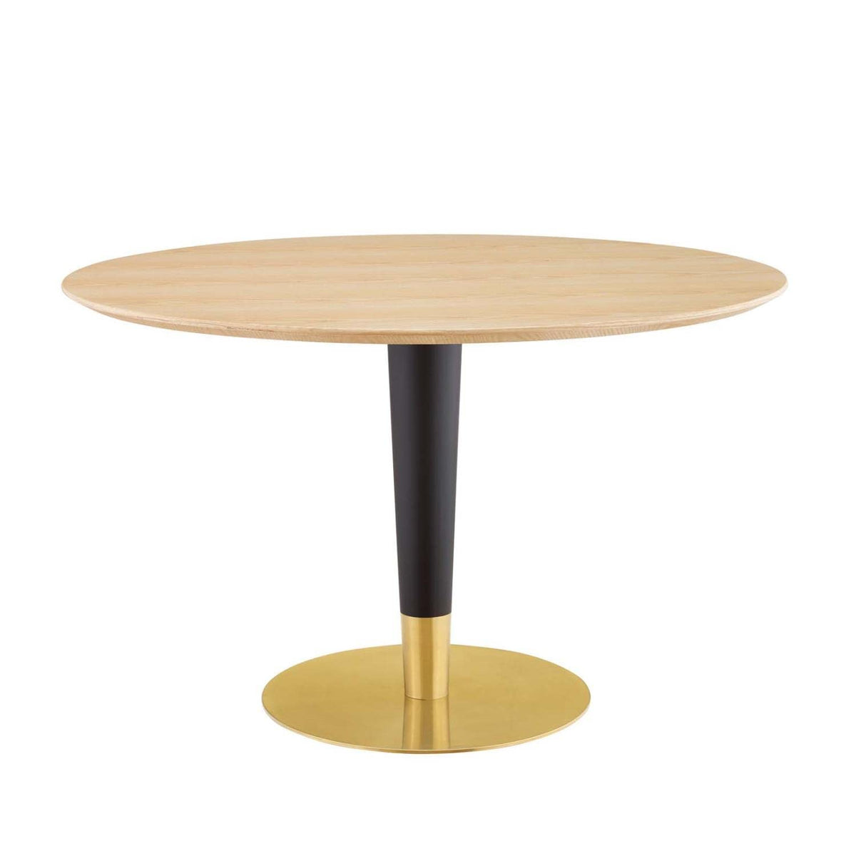 Gather family and friends for good food and conversation around the Zinque Dining Table. Bringing modern influence and mid-century inspiration to your dining space, this pedestal table reflects an organic shape. Perfect for entertaining or everyday dining, this dining table rests on a black and polished gold tapered base and features a 47" circular tabletop crafted with MDF and an easy-to-clean wood grain veneer. Non-marking ring to protect flooring. Assembly required.