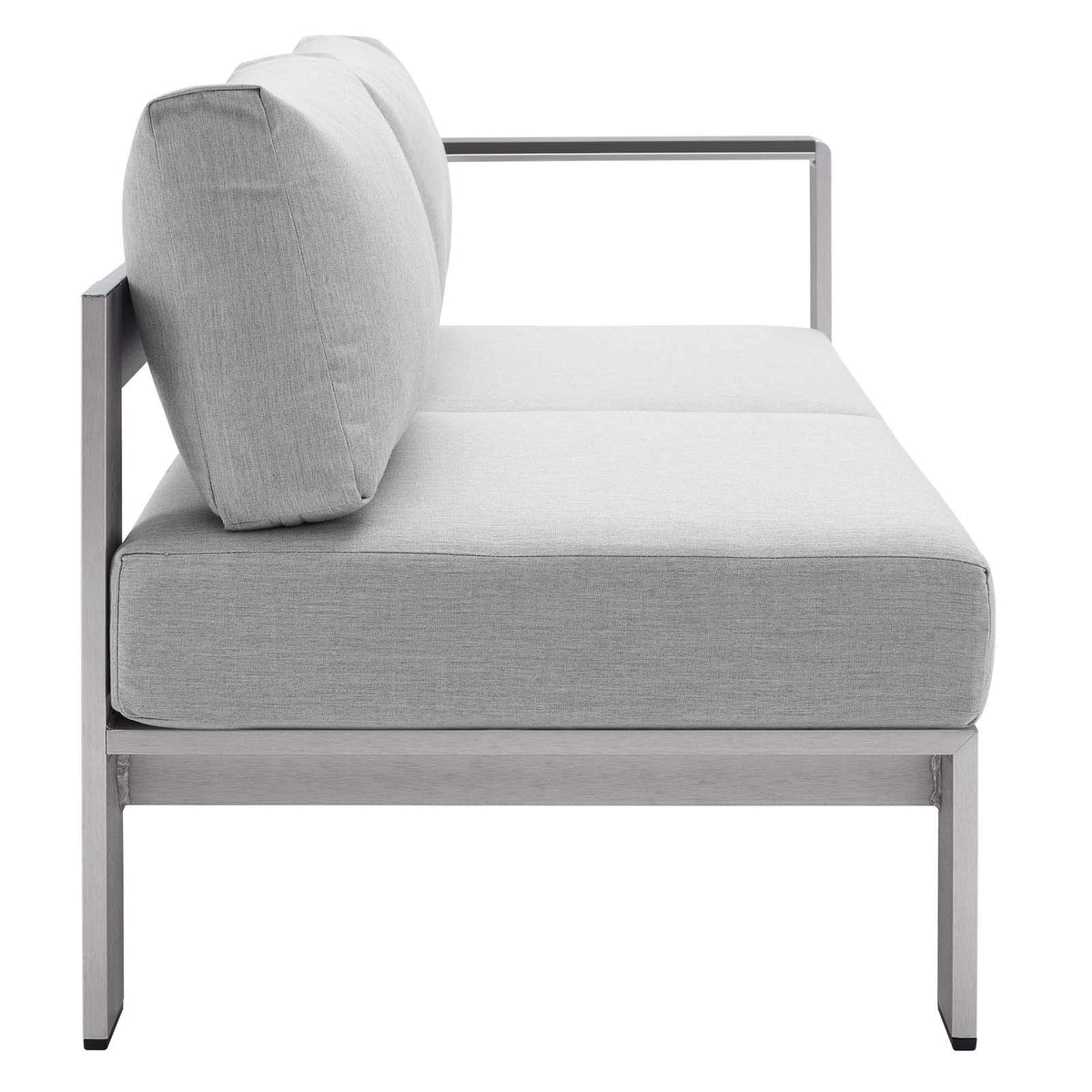 Enjoy your patio or backyard leisure time with the strong and durable Shore Outdoor Patio Aluminum 7 Piece Sectional Sofa Set. Made with anodized brushed aluminum frames and non-marking black plastic foot caps, Shore comes outfitted with resilient Sunbrella® fabric canvas cushions tested to last through all weather conditions. The Shore Outdoor Sectional Sofa Set complements your casual gatherings with a look and functionality you can rely on. Set Includes: 1 Left-Arm Sofa, 1 Right-Arm Sofa, 3 Armless Chairs, 2 Armchairs Set Includes: One - Shore Left-Arm Loveseat One - Shore Right-Arm Loveseat Three - Shore Armless Chair Two - Shore Armchair Product Dimensions: Overall Right-Arm Loveseat Dimensions: 27.5"L x 53"W x 25"H Seat Dimensions: 27.5"L x 50"W x 16.5"H Armrest Dimensions: 27.5"L x 8"W x 25"H Backrest Dimensions: 13.5"H Seat Cushion Dimensions: 27"L x 25"W x 5"H Overall Armless Chair Dimensions: 27.5"L x 25"W x 23.5"H Seat Dimensions: 27.5"L x 23.5"W x 11"H Backrest Dimensions: 25"W x 14"H Seat Cushion Dimensions: 27"L x 25"W x 5"H Overall Armchair Dimensions: 27.5"L x 32"W x 25 - 30"H Seat Dimensions: 27.5"L x 25 - 27.5"W x 16.5"H Armrest Height from Seat: 8"H Backrest Height: 7"H Armrest Dimensions: 27.5"L x 0.5"W x 25"H Overall Product Dimensions: 114.5"L x 170"W x 25"H