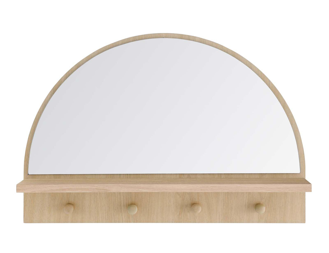 A modern addition to your home or apartment, the Moonbeam Arched Mirror is an eye-catching addition. Featuring an arched design with a shelf and four pegs, this wall mirror is ideal for the entryway, hallway, or mudroom. The sleek style and half-circle silhouette bring a touch of modern elegance to your space while offering organization and storage for keys, dog leashes, hats, and a variety of other small items. This mirror is crafted from mindi wood and particleboard with a wood grain laminate that brings a rich, organic aesthetic to its surroundings. Minimal assembly required.