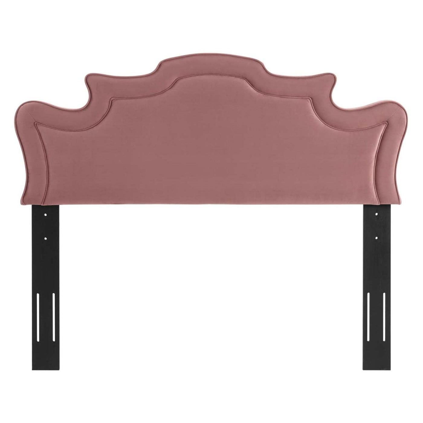 Create a relaxing oasis in your master bedroom or guest room with the Evangeline Performance Velvet King/California King Headboard. This Victorian-style headboard, sturdily constructed on a solid plywood and MDF frame, boasts flowing symmetry, creating a harmonious bedroom focal point. Complementing mid-century modern or eclectic decors, Evangeline features stain-resistant performance velvet upholstery with delicate French piping and dense foam padding. This padded headboard for king or Cali king beds provides a reliable backrest for sitting in bed and brings balance and beauty to your bedroom. Evangeline is a height-adjustable headboard.Features:Materials: Performance velvetFinish: Dusty rose pinkStain-resistant fabricDense foam paddingSturdy construction3 mounting positionsSpecifications:Product Dimensions: 25"H x 82.5"W x 2.5"DProduct Weight: 42 lbs