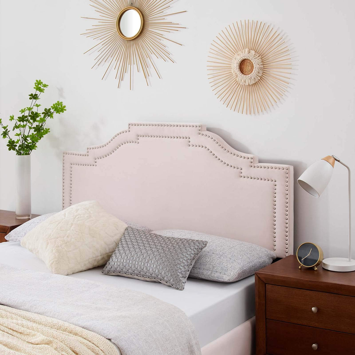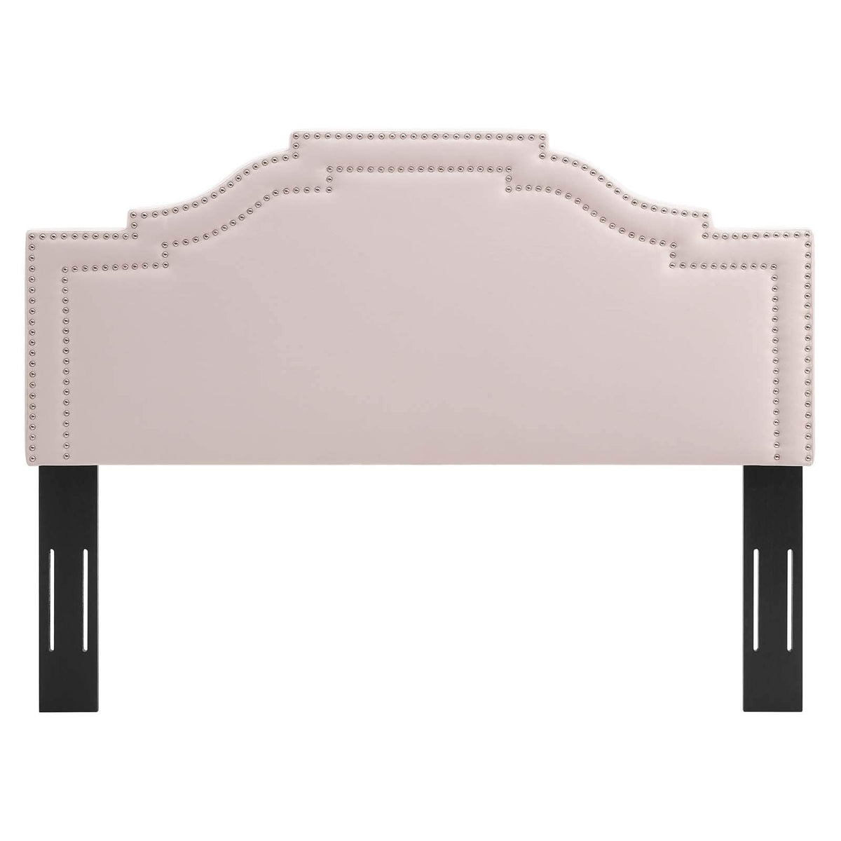 Influence glam deco style in a master bedroom or guest suite with the Lucia Performance Velvet King/California King Headboard. Featuring a double trim of nailheads and a unique arched shape, this velvet headboard brings tactile luxury to the bedroom. Covered in soft, stain-resistant performance velvet, this king/Cali king size headboard is padded in dense foam offering a supportive place to rest while sitting up in bed. A backdrop for a variety of bedding and sham styles, this height-adjustable headboard fits king or California king size bed frames with its three mounting positions. Assembly required.