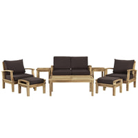 Harbor Your Greatest Expectations With This Luxurious Solid Teak Wood Outdoor Set. Marina Has A Seating Arrangement Perfect For Every Member Of Your Crew As You Breathe The Fresh Crisp Air Of A Day Spent With Friends And Family. Known For Its Natural Ability To Withstand Extreme Weather Conditions, Teak Is The Wood Selection Of Choice For Long-Lasting Outdoor Furnishings. Now You Can Enjoy Marina'S Durable Construction And All-Weather Cushions, Alongside A Modern Design That Persistently Looks New And Welcoming. Zoom In On The Product Image Before You, And See The Exquisite Texture And Detail For Yourself. Set Includes: One - Marina Teak Coffee Table One - Marina Teak Sofa Two - Marina Teak Armchair Two - Marina Teak Ottoman Two - Marina Teak Side Table Product Dimensions: Overall Armchair Dimensions: 31.5"L X 32.5"W X 31.5"H Overall Sofa Dimensions: 32.5"L X 56.5"W X 31.5"H Overall Ottoman Dimensions: 23.5"L X 21"W X 11"H Overall Coffee Table Dimensions: 23.5"L X 47"W X 17.5"H Overall Side Table Dimensions: 19.5"L X 19.5"W X 19.5"H Seat Dimensions: 31"L X 26"W X 12"H Backrest Height: 20"H Armrest Height: 12"H Floor To Underside Of Table: 16.5"H Table Top Thickness: 1"H Overall Product Dimensions: 54.5"L X 160.5"W X 31.5"H