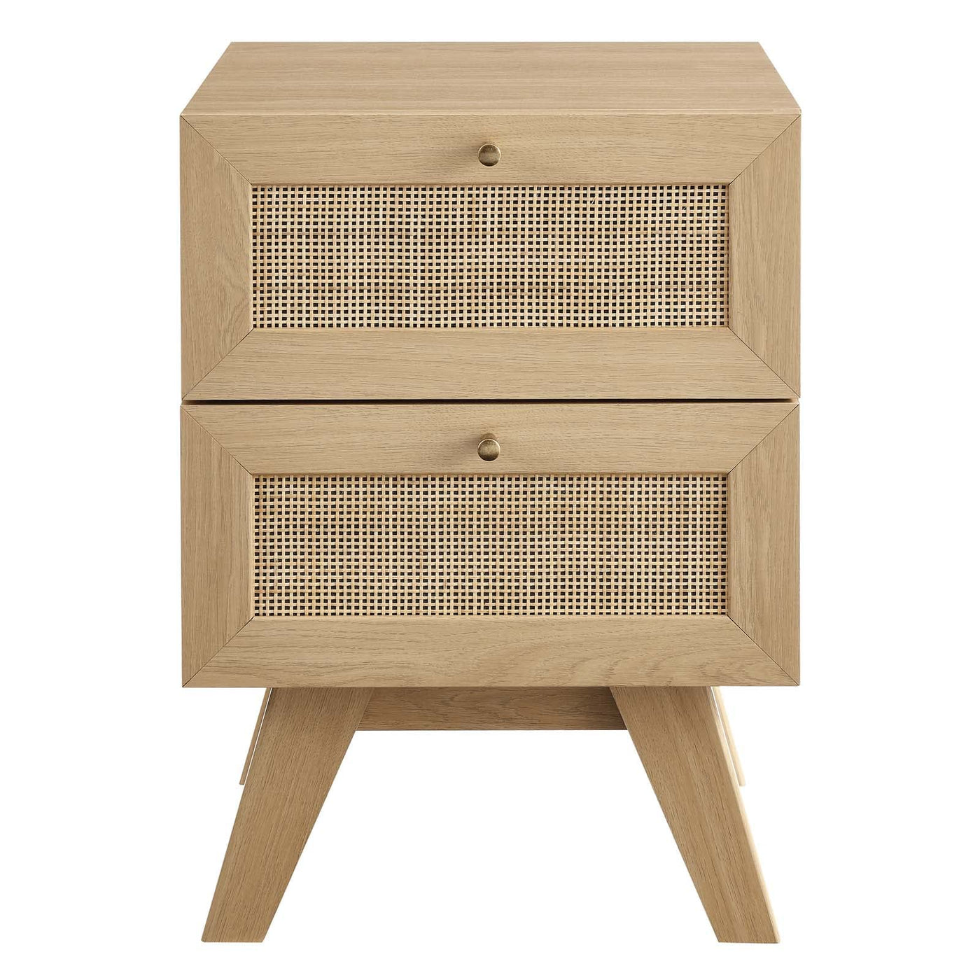 Introduce refreshing style to a primary or guest bedroom with the Soma 2-Drawer Nightstand. Showcasing a beautiful rattan weave on the squared drawer fronts, this nightstand brings organic aesthetics and modern functionality to a bedroom space or living area when used as a side table. This accent table is crafted from durable MDF and particleboard with a natural wood grain finish. This bedside table is complete with two full-extension glide drawers to help conceal bedside essentials. Resting on splayed legs, Soma includes non-marking foot pads to protect flooring. Assembly required.