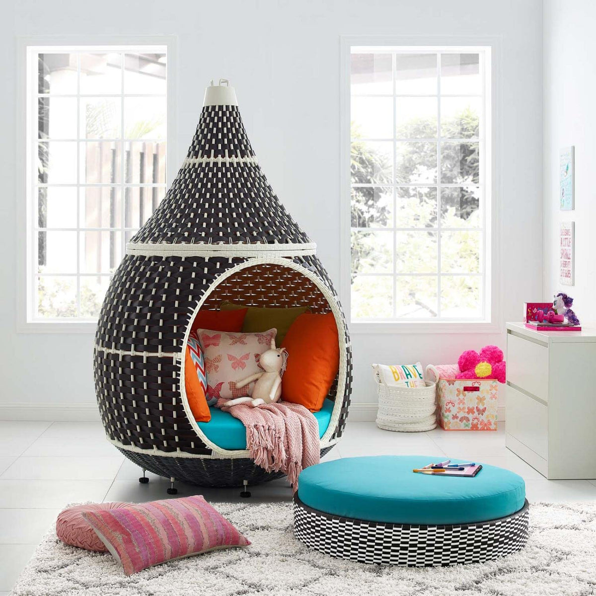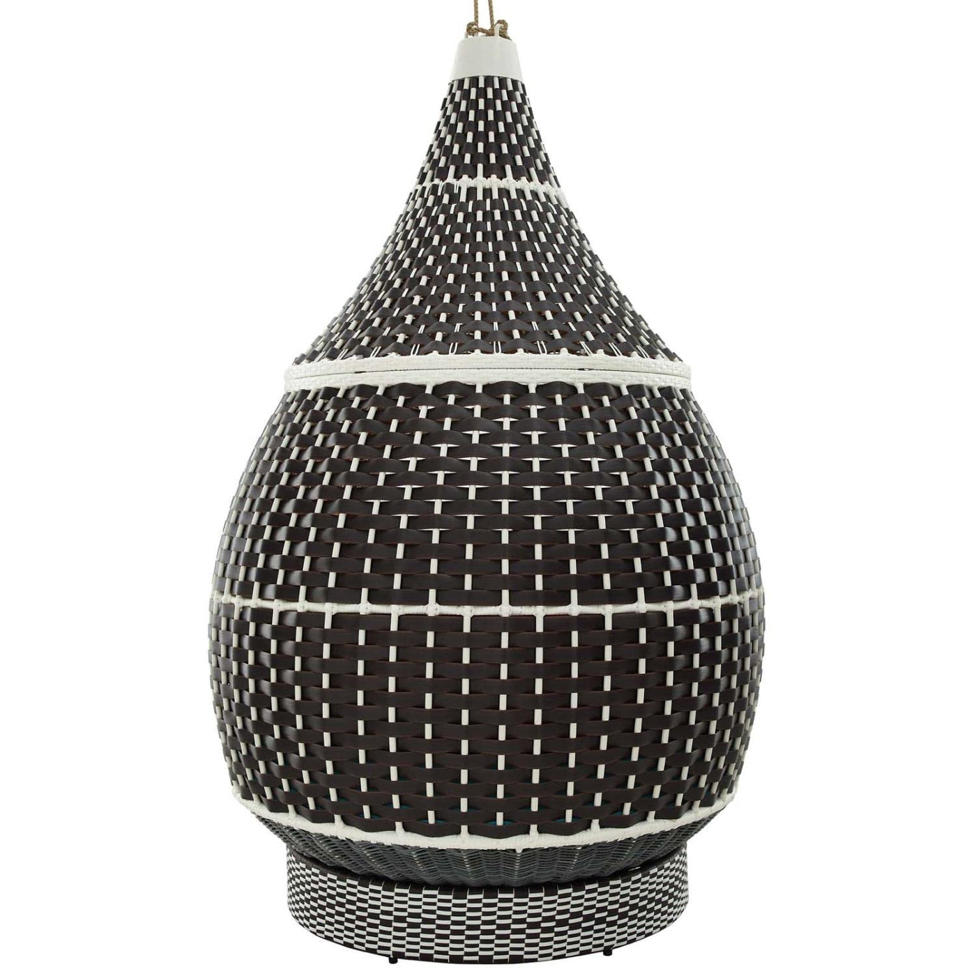 Engage a more free-spirited you with the Palace Outdoor Patio Rattan Hanging Swing Pod. Crafted with UV-resistant synthetic rattan and a sturdy powder-coated aluminum frame, Palace Swinging Pod Chair features all-weather fabric cushions, throw pillows, two-tone synthetic rattan, and a stylish teardrop shape which create a fun and relaxing place to sit back and unwind. Outfit your outdoor patio, porch, backyard, poolside, indoor playroom or college dorm with this versatile lounge pod that can hang suspended as a swing or perch on four legs. The base doubles as a round ottoman or decorative accent. Weight Capacity: 440 lbs.