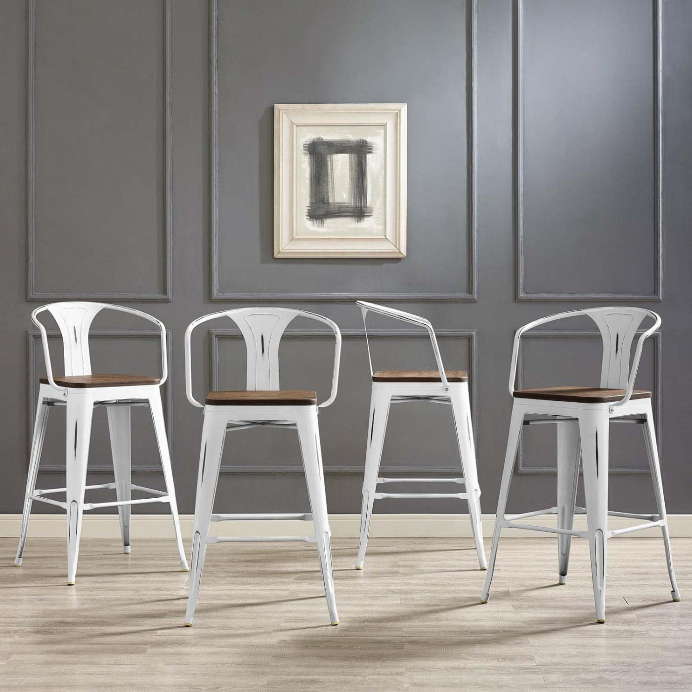 Usher In Eclectic Decor With The Promenade Arm Bamboo And Metal Bar Stool. Complete With A Vintage Powder Coated Steel Finish, Promenade Exhibits The Charm Of The Classic Bistro While Upgrading Your Breakfast Nook Or Bar Area With A Striking Industrial Modern Piece That Breathes Exceptionalism. Mix-And-Match With A Stool That Transforms Eating Spaces And Enlivens Bar Time.Features:Set Includes: 4 Bar Stoolsmaterial: Metal, Bamboofinish: White, Browncafe And Bistro Style Bar Stoolpowder Coated Steellaminated Bamboo Seatspecifications:Product Dimensions: 41.5"H X 82"W X 21"Dproduct Weight: 83 Lbsproduct Dimensions: (Bar Stool) 21"L X 20.5"W X 41.5"Hseat Dimensions: 19"L X 19"W X 30"Hproduct Dimensions: (Backrest Height) 11.5"Hproduct Dimensions: (Armrest Height From Seat) 8.5"Hweight Capacity: 331 Lbs