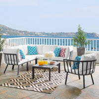 Refresh Your Outdoor Decor With The Riverside Outdoor Patio Aluminum Sectional Set. This Set Includes Riverside Outdoor Patio Armchair And Table. Defined By A Crisp, Coastal Style, This Installment Of The Riverside Outdoor Sectional Sofa Furniture Collection Features An Open Slatted Back Design, Angled Back Legs, And Plush 4" Thick All-Weather Uv-Resistant Fabric Cushions. Solidly Constructed With A Powder-Coated Aluminum Frame, The Riverside Outdoor Sectional Will Enhance The Look Of Your Patio, Backyard, Balcony, Porch, Deck, Or Poolside Area. Table Constructed With A White Powder-Coated Aluminum Frame And Smooth Scratch-Resistant Cement Top, Durable, All-Weather Outdoor Coffee Table Perfect For Any Outdoor Get Together. Includes Foot Caps. Seat Weight Capacity: 300 Lbs Set Includes: One - Riverside Aluminum Coffee Table One - Riverside Armchair Three - Riverside Corner Chair Two - Riverside Armless Chair Product Dimensions: Overall Product Dimensions: 85. 5"L X 114"W X 28"H Sectional Dimensions: 85. 5"L X 85. 5"W X 28"H Armchair Dimensions: 28. 5"L X 32"W X 28"H Table Dimensions: 23"L X 39"W X 15. 5"H Individual Armless Chair Dimensions: 29. 5"L X 26. 5"W X 28"H Individual Corner Chair Dimensions: 29. 5"L X 29. 5"W X 28"H Seat Dimensions: 26. 5"L X 26. 5"W X 17"H Backrest Height: 11"H Cushion Thickness: 4"H
