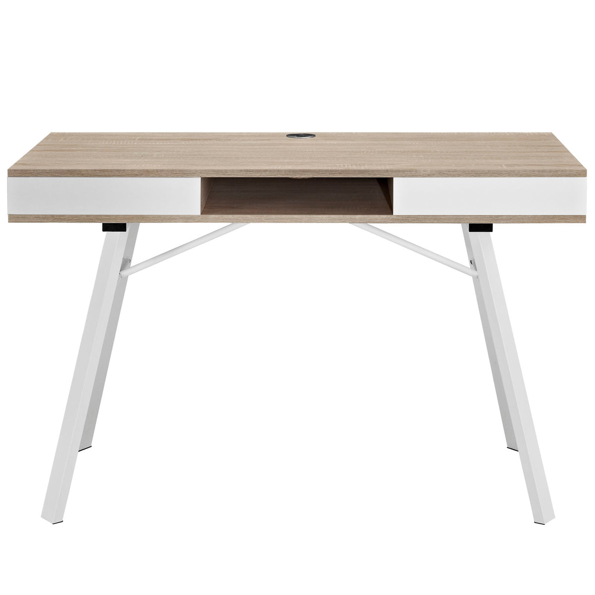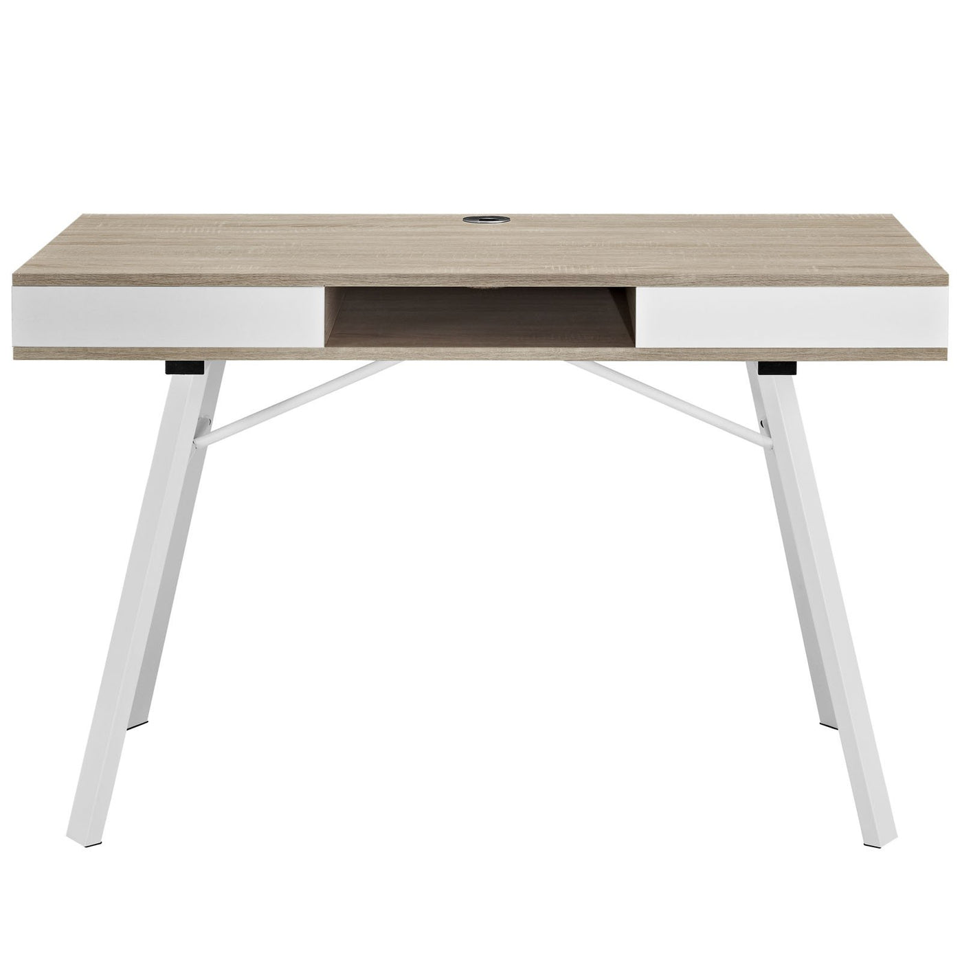 Just the right amount of activity complements the aesthetically calming Stir desk. Complete with easy-glide right and left storage drawers, a center cubby, and powder coated white steel A-frame legs, Stir is a compact piece that carries big rewards. Fully equipped with top and bottom reinforced cord holes, Stir doubles as either a computer or writing desk. The smooth melamine finish is patterned as wood-grained oak, giving the piece its overall soothing feel. Set Includes: One - Stir Office Desk Product Dimensions: Overall Product Dimensions: 23"L x 47"W x 30"H Width of inner drawer space: 12.5"W Height of inner drawer space: 2.5"H Floor to underside of table: 25.5"H Space between legs: 43.5"W Table top thickness: 4.5"H