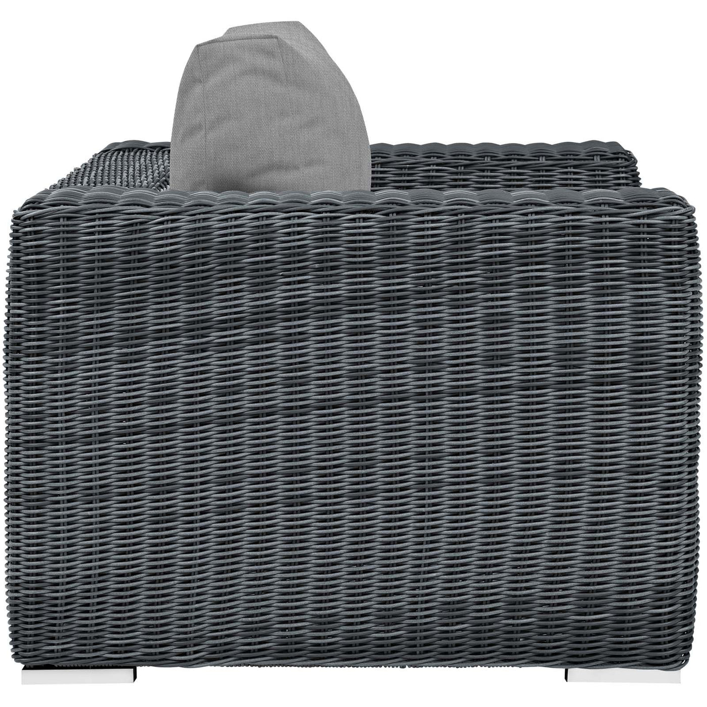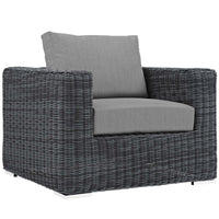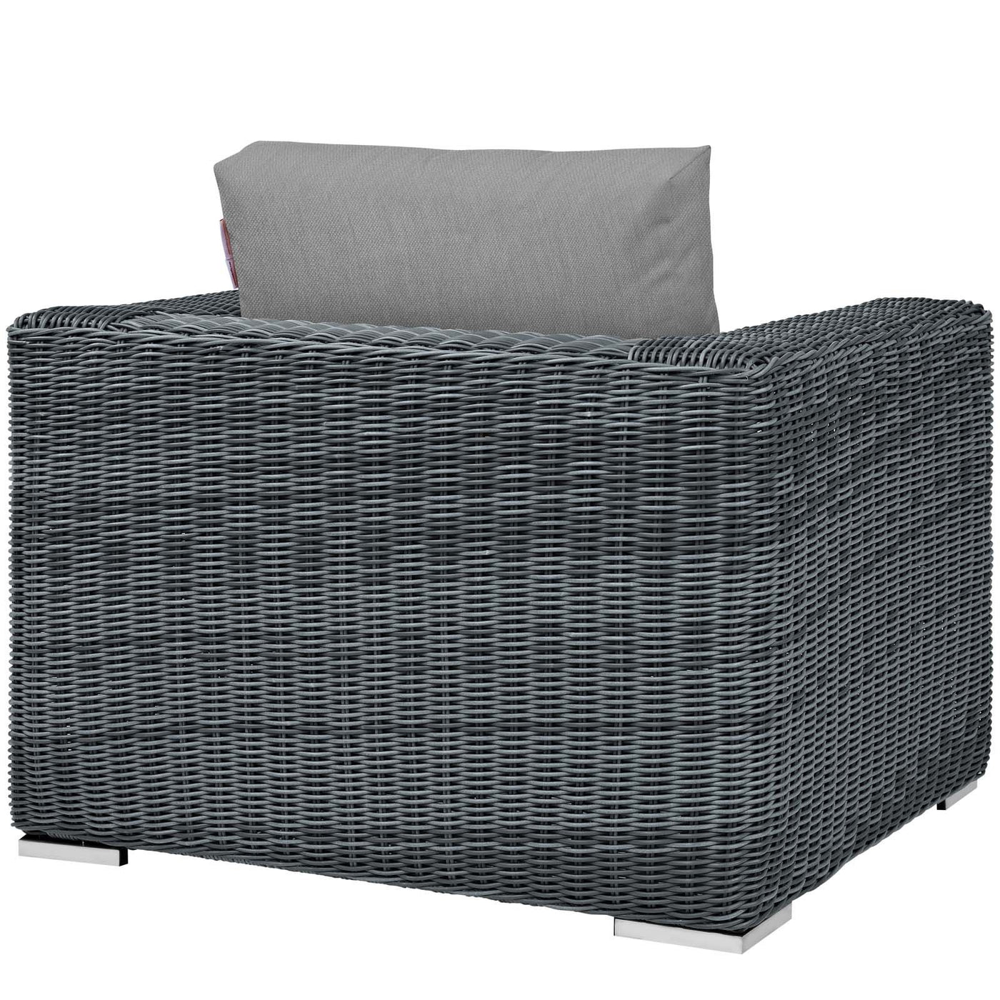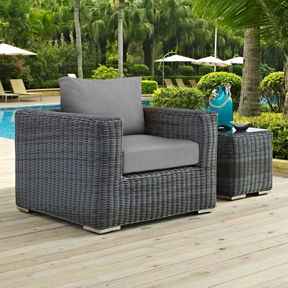 Experience the outdoors with exceptional comfort and quality. Summon Outdoor Patio Arm Chair offers an exquisite two-tone synthetic rattan weave, plush all-weather cushions with industry-leading Sunbrella fabric, UV protection, and a sturdy powder-coated aluminum frame. Featuring an elegant modern look, Summon Patio Arm Chair is part of an avant-garde outdoor sectional series well-equipped for enhancing patio, backyard, or poolside gatherings. This installment of the series is an Outdoor Patio Arm Chair.