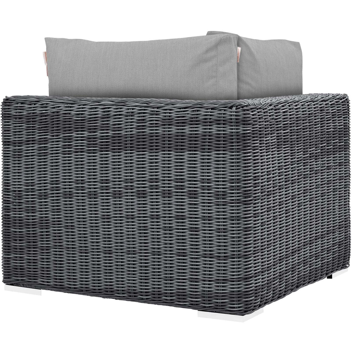 Experience the outdoors with exceptional comfort and quality. Summon Outdoor Patio Corner offers an exquisite two-tone synthetic rattan weave, plush all-weather cushions with industry-leading Sunbrella fabric, UV protection, and a sturdy powder-coated aluminum frame. Featuring an elegant modern look, Summon Patio Sectional Sofa Corner Chair is part of an avant-garde outdoor sectional series well-equipped for enhancing patio, backyard, or poolside gatherings. This installment of the series is an Outdoor Patio Corner Sofa Chair.