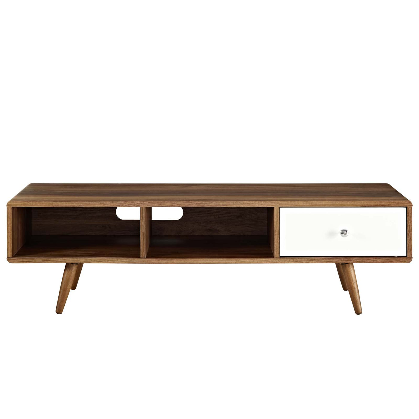 Harness the iconic energy of mid-century modern style with the Transmit 55” TV Stand. Transmit features a full-extension white lacquer drawer with abundant concealed and open storage, durable particleboard with smooth walnut grain laminate, and four splayed wood legs. Complete with a cable management hole accessible to both open storage spaces, easily manage your media needs while keeping your space looking visually clean. Transmit is the perfect low profile TV stand for the contemporary home.