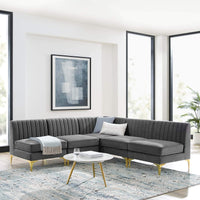 Elevate Your Living Space With The Visual Appeal And Linear Detail Of The Triumph Channel Tufted Performance Velvet 5-Piece Sectional Sofa. With Interior Channel Tufting And Luxe Velvety Texture, This Sectional Sofa Abounds In Retro Modern Style And Glam Deco Charm. This Couch Is Part Of A Sectional Sofa Collection That Allows You To Create A Seating Solution That Works For Your Living Room, Bedroom, Office Space, Entryway, Or Lounge Area. This Upholstered Sectional Sofa Is Covered In Stain-Resistant Performance Velvet And Features Dense Foam Padding And A Sinuous Spring Support System For A Premium Seating Experience. The Velvet Sofa Sits On Four Gold Metal Legs With Non-Marking Foot Caps To Protect Your Flooring. Weight Capacity For Each Sectional Sofa Piece: 440 Lbs.