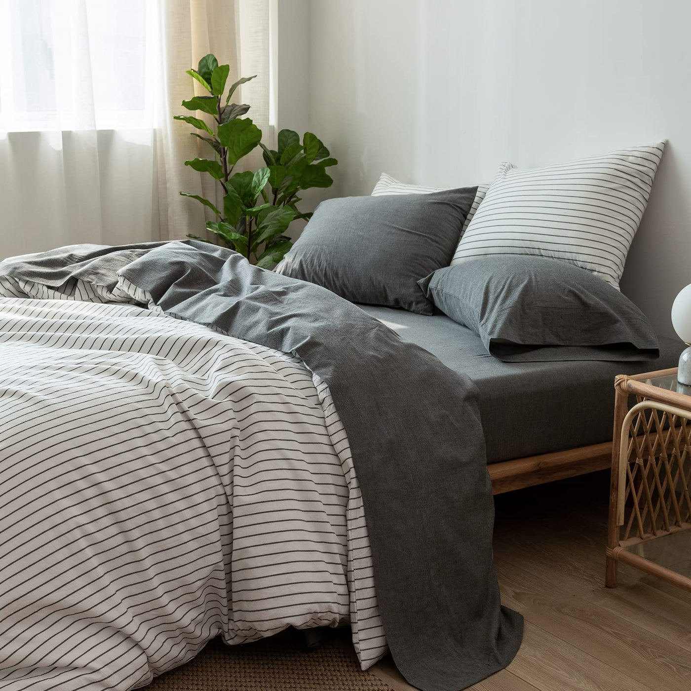 Moomee Bedding Sheet Set 100% Washed Cotton Linen Like Textured Breathable Durable Soft Comfy (Dark Grey, Queen)