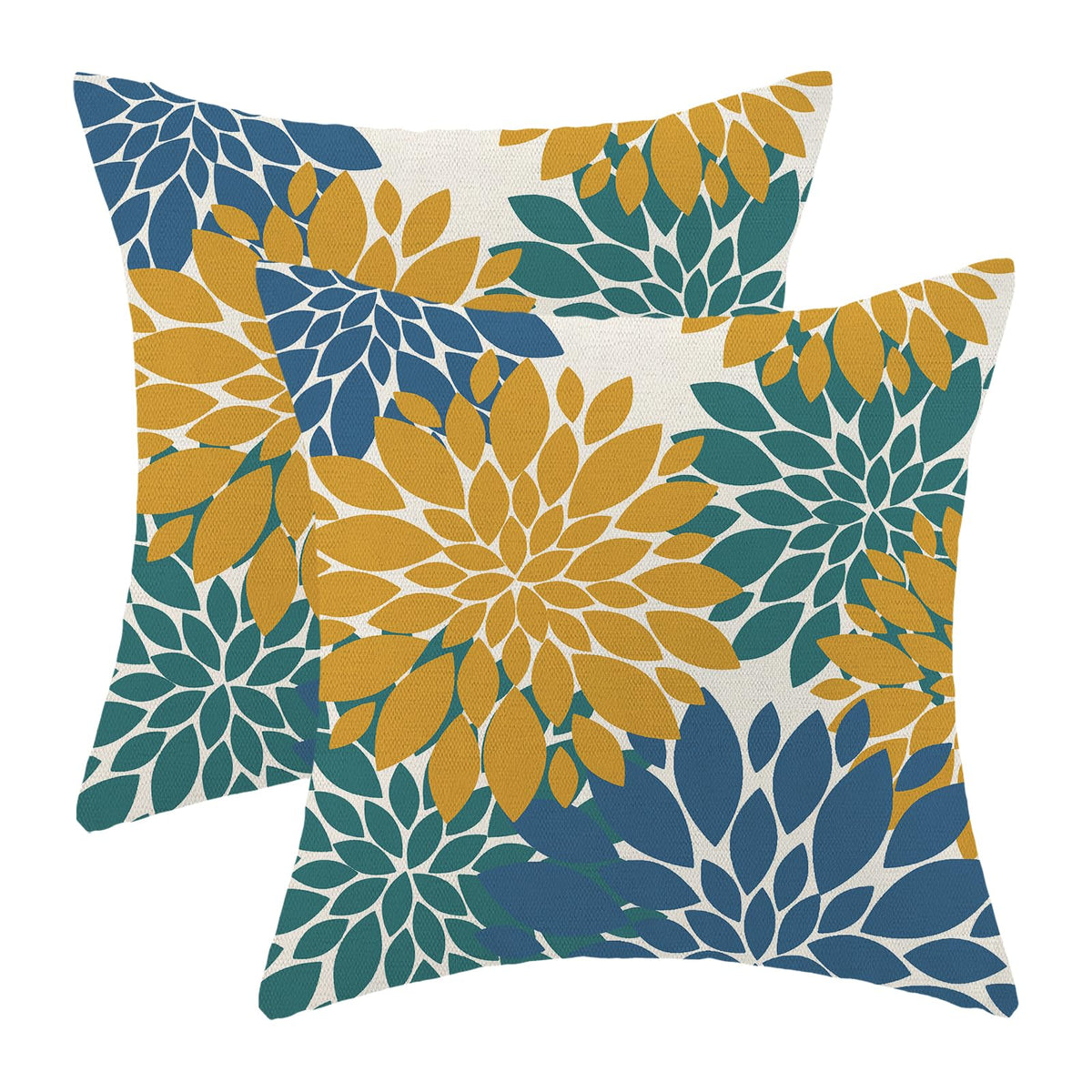 Mustard Yellow Navy Blue Pillow Covers 18X18 Inch Set Of 2 Teal Dahlia Floral Decor Throw Pillows Summer Modern Geometry Flower