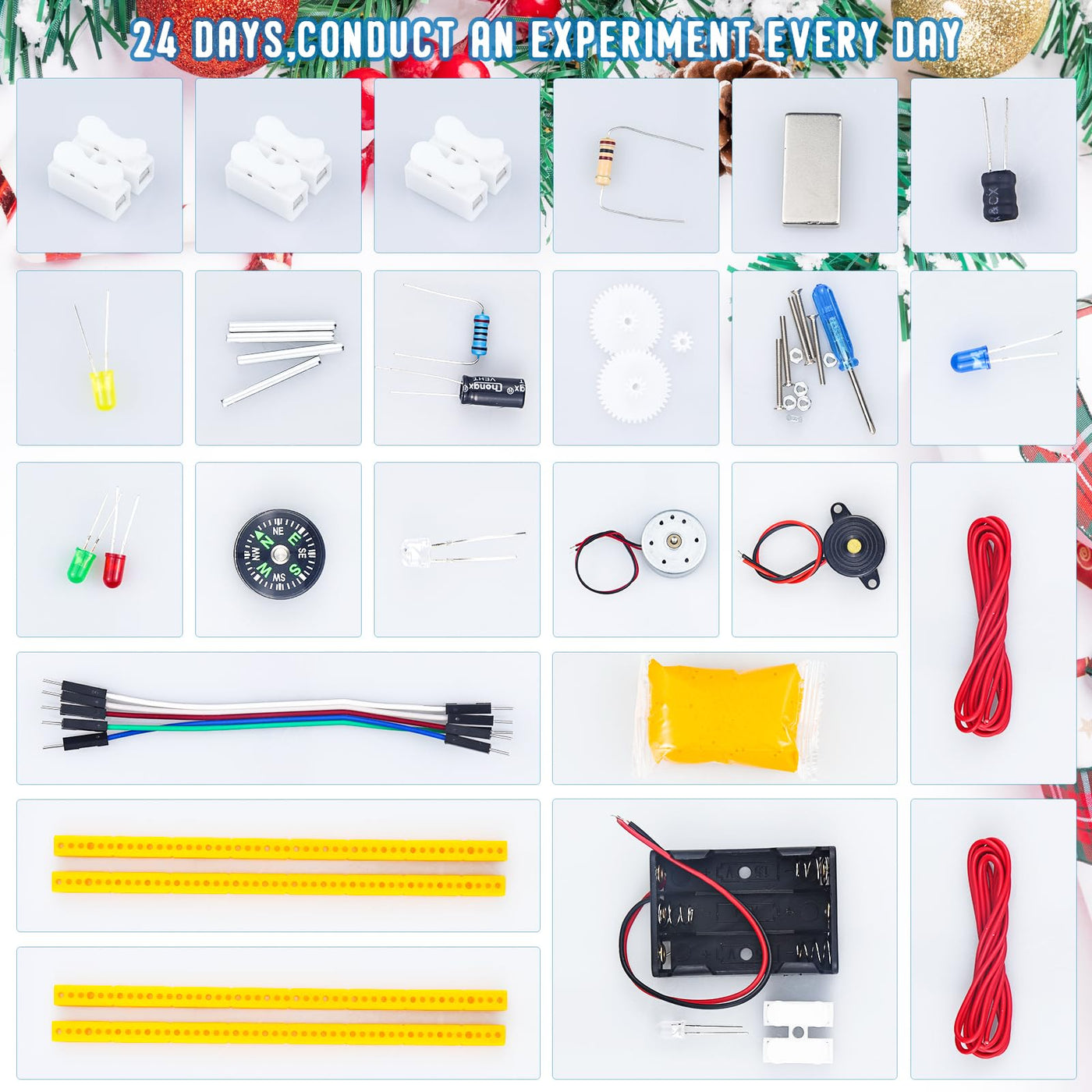 Q: What types of experiments can I expect with this advent calendar?A: Each day of the Myouth Scientist Advent Calendar introduces a new electronic component, allowing you to build 24 different electronic models. These experiments range in difficulty, providing a mix of challenges suitable for both independent and parent-assisted completion.